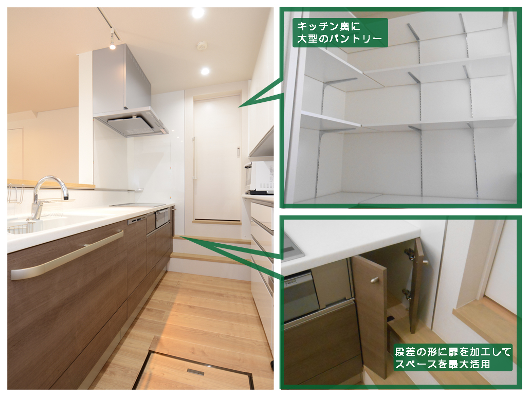 キッチンの設置場所の異なるプランを3つ提案させて頂き、陽当たりの良い対面キッチンプランを採用されました。 リビング側の立ち上がりの壁には無垢材を張り付けています。 キッチンの横にステップがあったのですがキッチン扉の一部に手を加えステップを回避できる扉にしました。 リビングとは完全に別の場所にあったダイニングキッチンを、リビング横の和室を改装して広いLDKにしました。