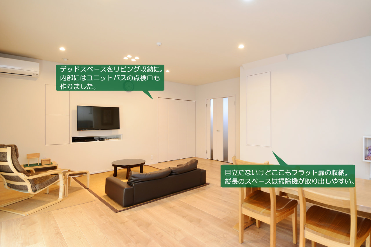 広いリビングの所々に収納箇所を設けていますが、目立たない様にしています。