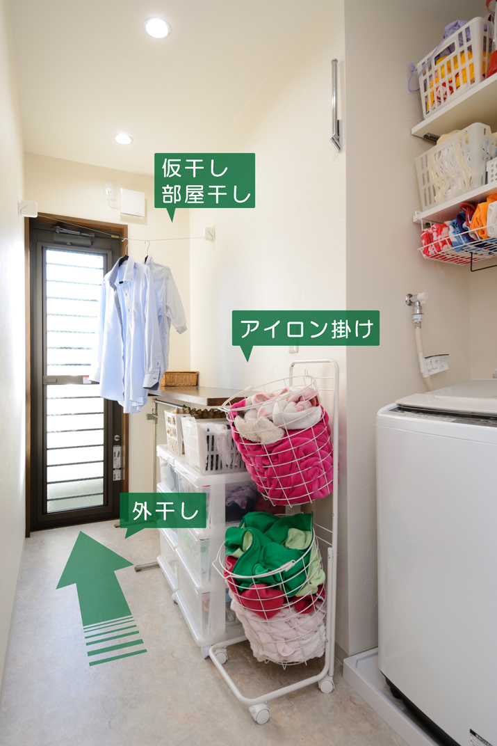 キッチン横に広めのパントリーを設けた事が奥様に気に入って頂けました。かさばる食料などを目立たせずに保管でき、出し入れもしやすくなっています。 2階にユーティリティを設け、洗濯機置き場、アイロン掛けが出来るカウンターなどを設置しました。これにより洗濯から干してたたむまでの導線がダイレクトに結ばれ作業効率がアップしました。