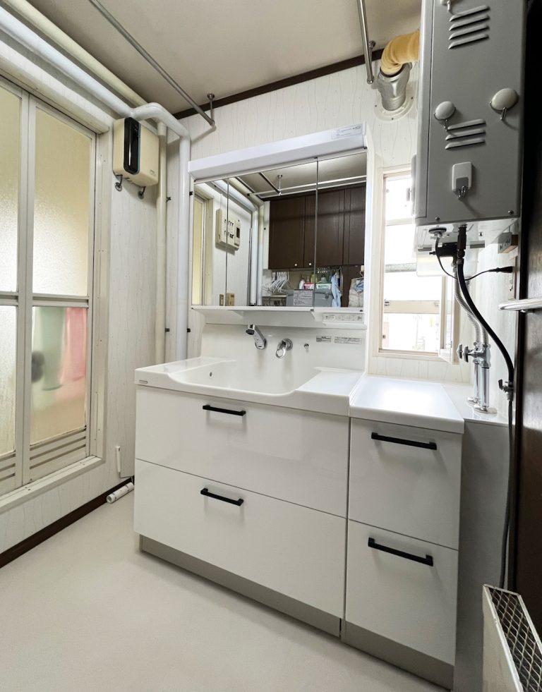 ・洗面所全体が明るくなり、毎朝の身支度が格段に快適になりました。 ・縁裏の黒ずみ問題が解消され、お手入れのストレスから完全に解放されました。 ・収納力が以前の倍以上に増えたことで、洗面台の外に置いていた物がすべて収納でき、洗面所がすっきり整理された状態を保てるようになりました。 ・配管更新により水漏れの不安がなくなり、設備としての安心感が向上しました。 ・愛猫が窓辺の専用スペースでくつろぐようになり、家族全員がより心地よく過ごせる洗面所になりました。