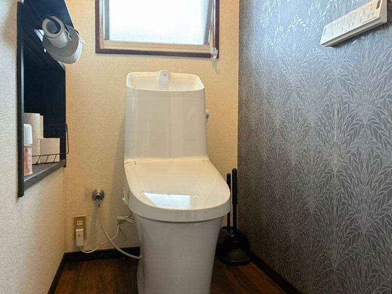 壁全面をグリーン色のクロスにし、床のクッションフロアは1Fとの色違いにしました。グリーンのクロスがとても目を惹き明るいトイレになりました。