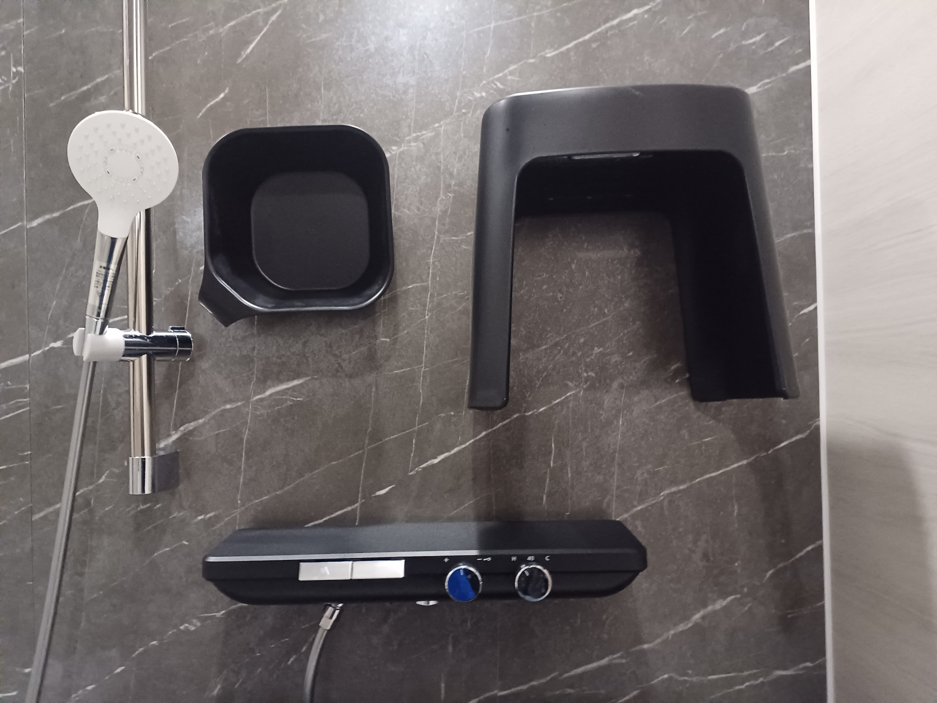 浴室の壁はマグネットが付く仕様なので、浮かせる収納が出来ます。