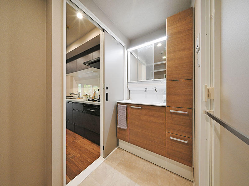 3LDKから2LDKへと間取りを変更し、リビングと寝室の間にファミリークローゼットを設けることで、収納力を大幅に向上させました。突板フローリングを採用し、シートフロアにはない温かみと高級感を兼ね備えた床材をご提案しました。さらに、テレビ背面には間接照明を設置し、昼と夜で異なる表情を楽しめる空間を実現しました。