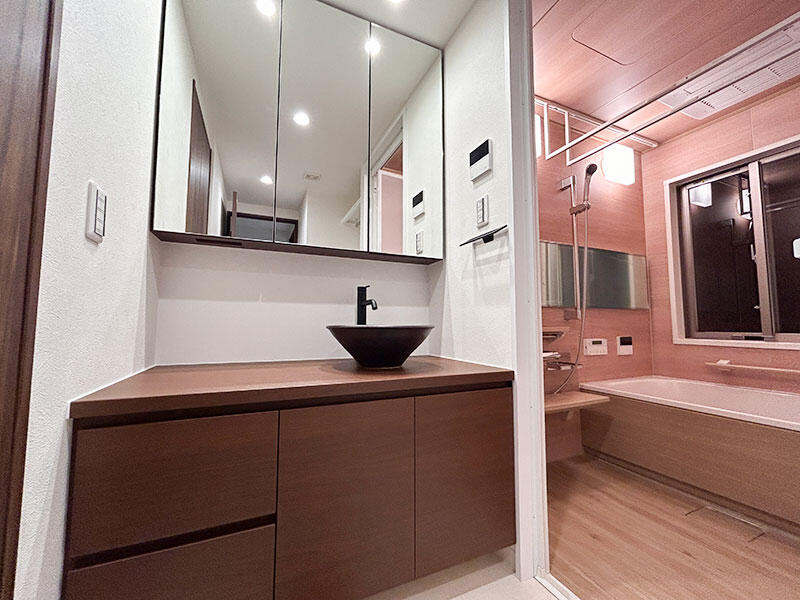お客様より「信楽焼の洗面ボウルを使いたい」とのご要望をいただきましたので、造作にて洗面台を設けるご提案をしました。また、リビングや洋室には天井まで高さのある収納棚を設置し、リフォーム後の生活がより快適に整いやすい空間づくりを。浴室は、木目調をご希望でしたので、クリナップの新モデル【セレヴィア】をご提案しました。