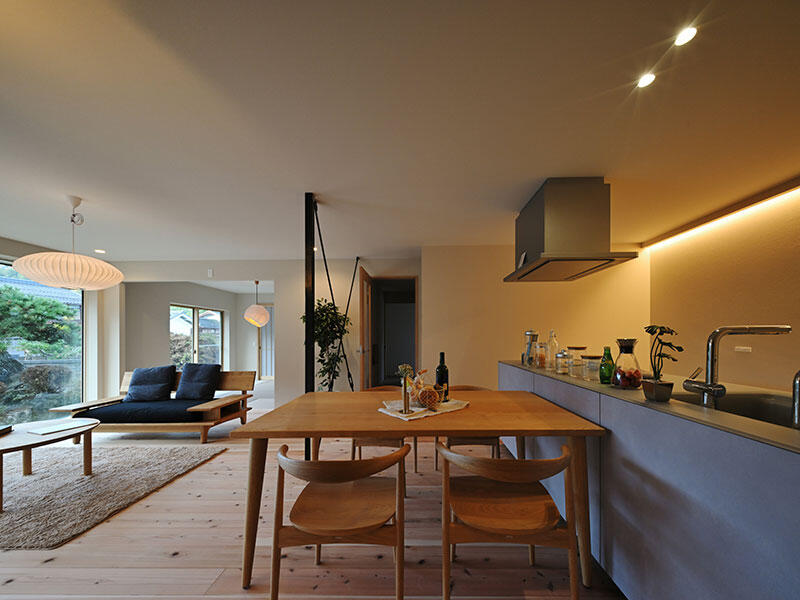 アイランドキッチンを採用し、リビングからお庭まで視線が抜ける開放的な間取りをご提案しました。窓はFIX窓とすることで余計な線が入らず、庭の景色を楽しめる空間に。和室の広さを調整し玄関を広く確保し、濡れ縁と造作建具を組み合わせることで和モダンの雰囲気を演出しました。