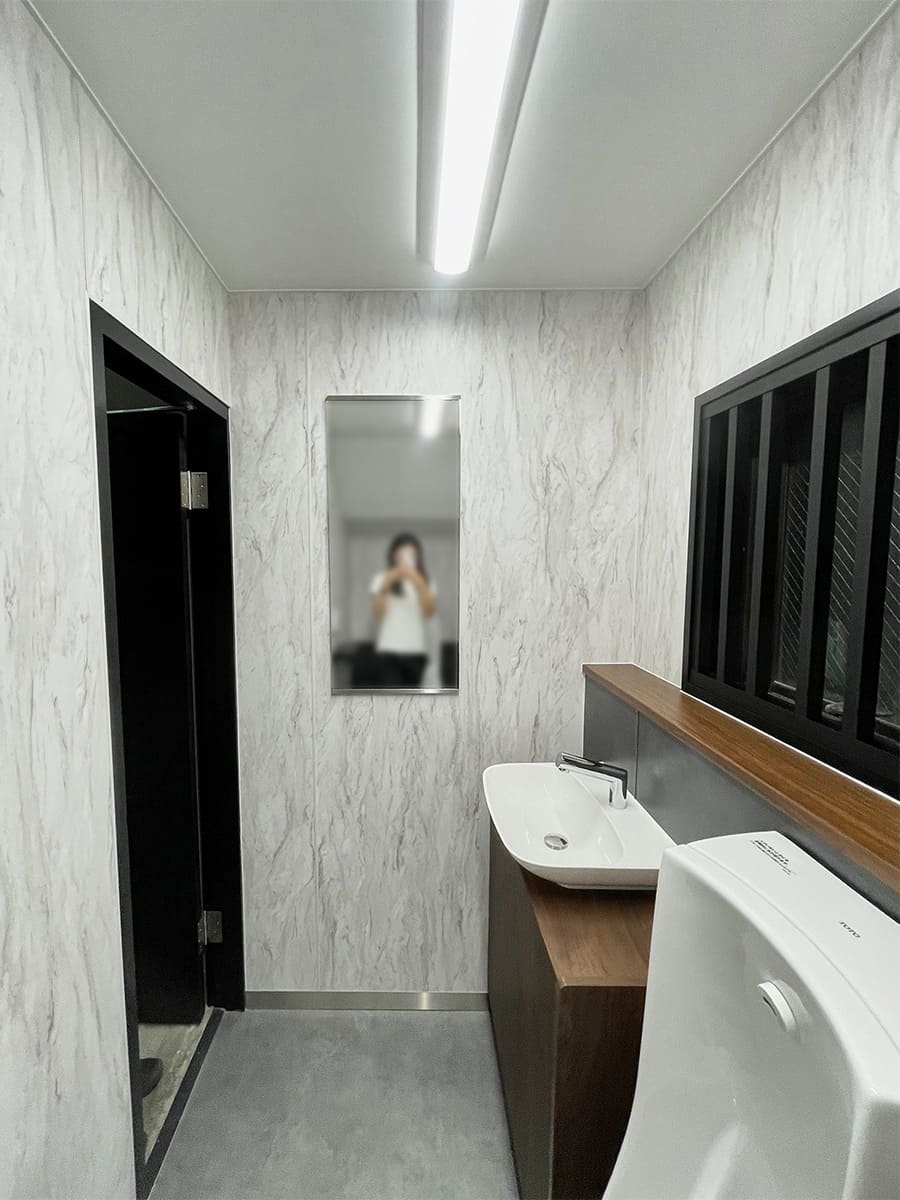 お客様からお悩みやご要望をお聞きし、ご希望に合った商品やデザインプランを提案いたしました。 今回はおしゃれな洋式トイレにしたいということが前提でしたので、お客様のイメージにあった、スタイリッシュな雰囲気のデザインを提案しました。壁材や格子、棚受け、ペーパーホルダーなどにブラックをポイント使いすることで、空間を引き締めモダンでかっこいいに内装に仕上げました。 機能面だけではなく、内装も重要視されていらっしゃいましたので、ご提案の際は3Dパースを活用し、イメージがしやすいよう心掛けました。また、スタッフの方だけでなく来客時にもお使いになるトイレとのことでしたので、清掃がしやすい内装材を使用したのもポイントです。