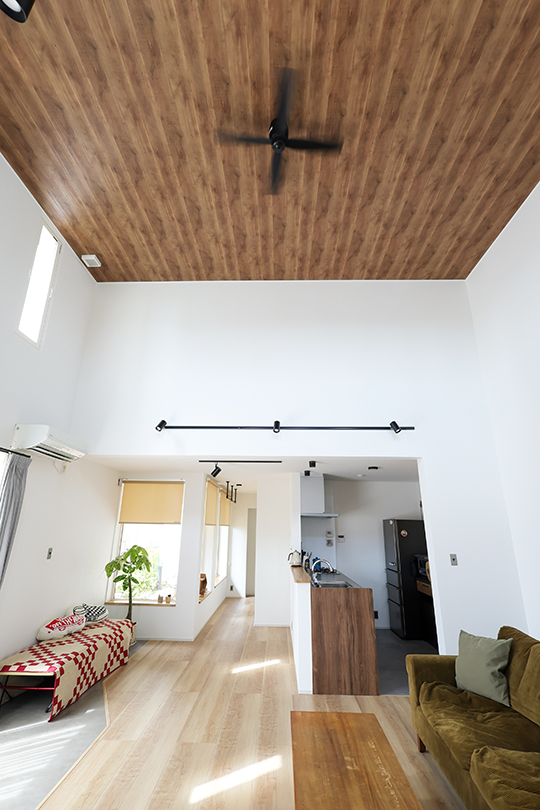 ゆったり広々したリビング。天井が高くファンをつけて空気を循環させています
