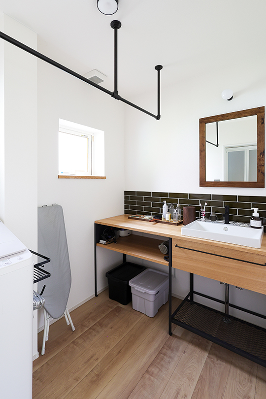 玄関周りにオープン収納を広く造り、お持ちのアウトドアグッズのメンテナンスや収納ができる様にしました。 サニタリールームなど、プライベート空間は部屋の奥に設置し、室内建具を付けなくても他者からの目線が気にならない間取りをご提案。建具を排した分、空間に余裕が生まれました。 洗面台等は、施主の好きなインテリアショップの商品を採用。現地打合わせをしながらスマホで購入。他のインテリア小物も、お気に入りのインテリアショップの商品を採用しました。