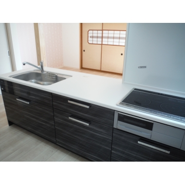 新婚ご夫婦の新居として、少しでも住みやすい環境をご提供できるよう、水廻りを中心の間取りに変更しました。 台所に隣接した和室6帖と廊下の一部を含めた空間を活用し、広々と開放的なLDKへの間取り変更をご提案させて頂きました。