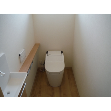 パナソニックの全自動おそうじトイレ「新型アラウーノ」を採用頂きました。 タンクレストイレは限られた空間を広く感じさせます。 1回の洗浄水量が4.8Lと節水でとても経済的! そのうえ全自動のおそうじトイレは、“泡のパワー”でしっかり洗ってくれます。 手洗いは、水アカをはじく有機ガラス系新素材のアラウーノ手洗い。 排水口まで一体成型で、おそうじラクラクです。