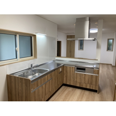 L型キッチンで対面式キッチンを実現。開放的キッチンに。
