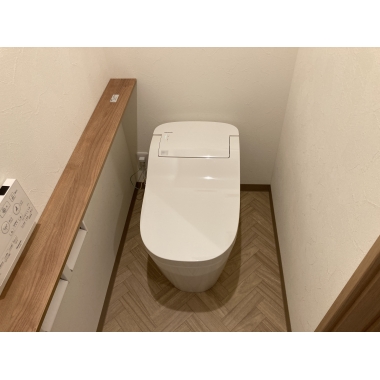 元々のトイレが0.7帖で奥行きが狭いものでした。同じ場所でトイレを広げると洗面室か廊下を狭くする必要がありそれで余計動線が悪くなり他の部屋が使いにくくなってしまいます。 そこで洋室の床の間にトイレを設けました。窓は無くなりましたが以前より広くて使いやすいトイレになりました。
