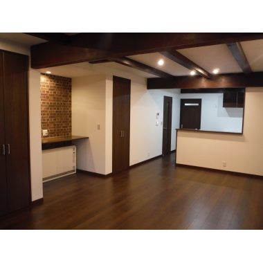 築50年を超える古民家で1階の階高が低い為、2階床梁をそのまま生かし古き良き味わいを趣豊かに甦らせました。レンガ調のアクセントクロスが違和感なく調和しモダンなリビングとして仕上がっております。間取りに制限がある中で家事動線が楽になりました。リフォーム後は、分かれていた空間がひとつにつながったことで、家全体の回遊性が向上し、移動や家事が格段にしやすくなりました。梁を活かした開放的なLDKは家族が自然と集まる場となり、以前よりも会話が増え、家時間をゆったり楽しめるようになったと喜んでいただいています。気候の変化にも強く、安心して長く住める住まいへと生まれ変わりました。