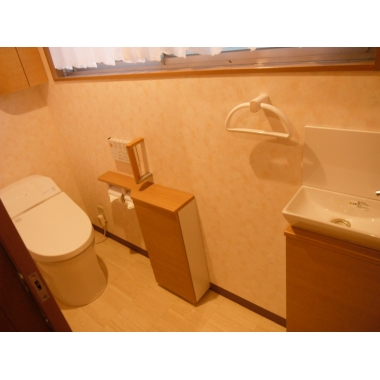 限られたトイレ空間のなかで圧迫感のないよう配置を工夫し、目的の収納物の応じて複数の収納を設けました! トイレットペーパーのストックや清掃道具などがスッキリ収納され、広々とした空間になりました。 ご高齢のご両親の使い勝手に合わせた手摺を設置し、床の段差も無くし解消しました。
