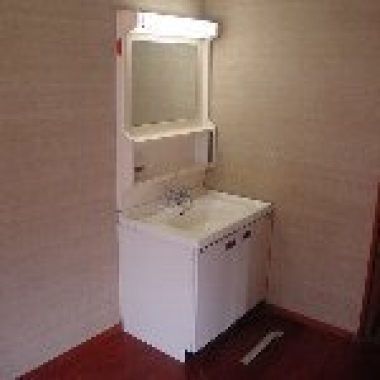 施工前は玄関ホールの隅に600サイズの化粧台が設置されていました。スペースを充分確保する事を目的に、取付箇所・設備機器共に変更しています。