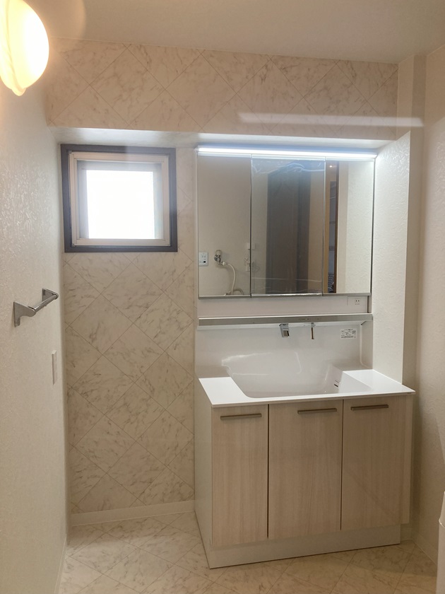 TOTO洗面化粧台「オクターブ」ペアホワイトウッドを採用いただきました。白を基調とした木目柄で、明るく清潔なデザインにより、空間が明るく優しい雰囲気になりました。
