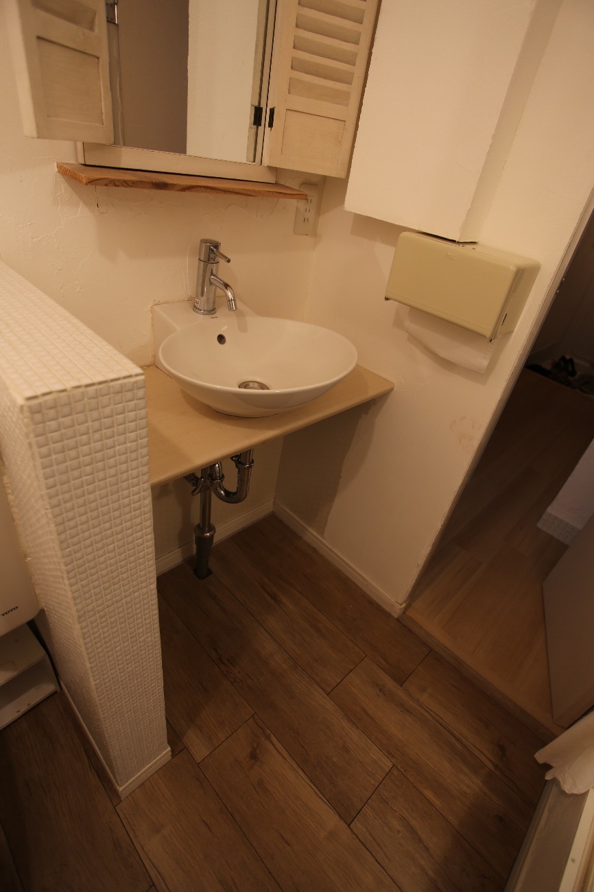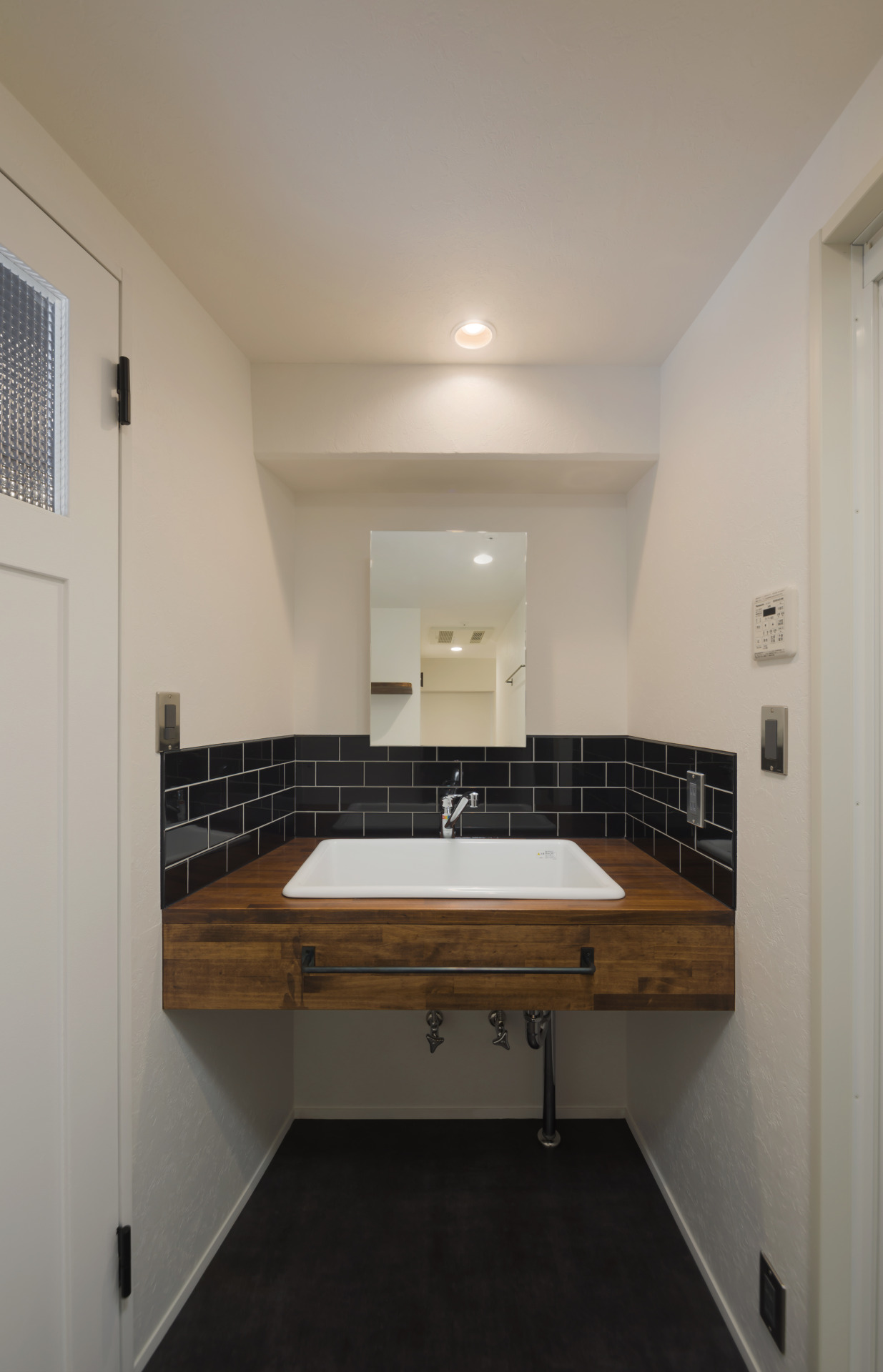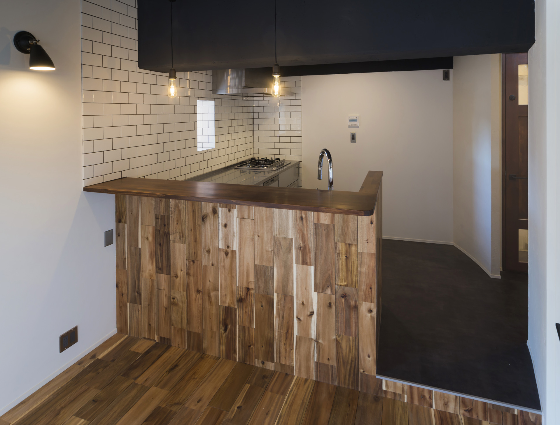 タイルと無垢材カウンターのコントラストが印象的。シンプルながら存在感のある、こだわりの空間
