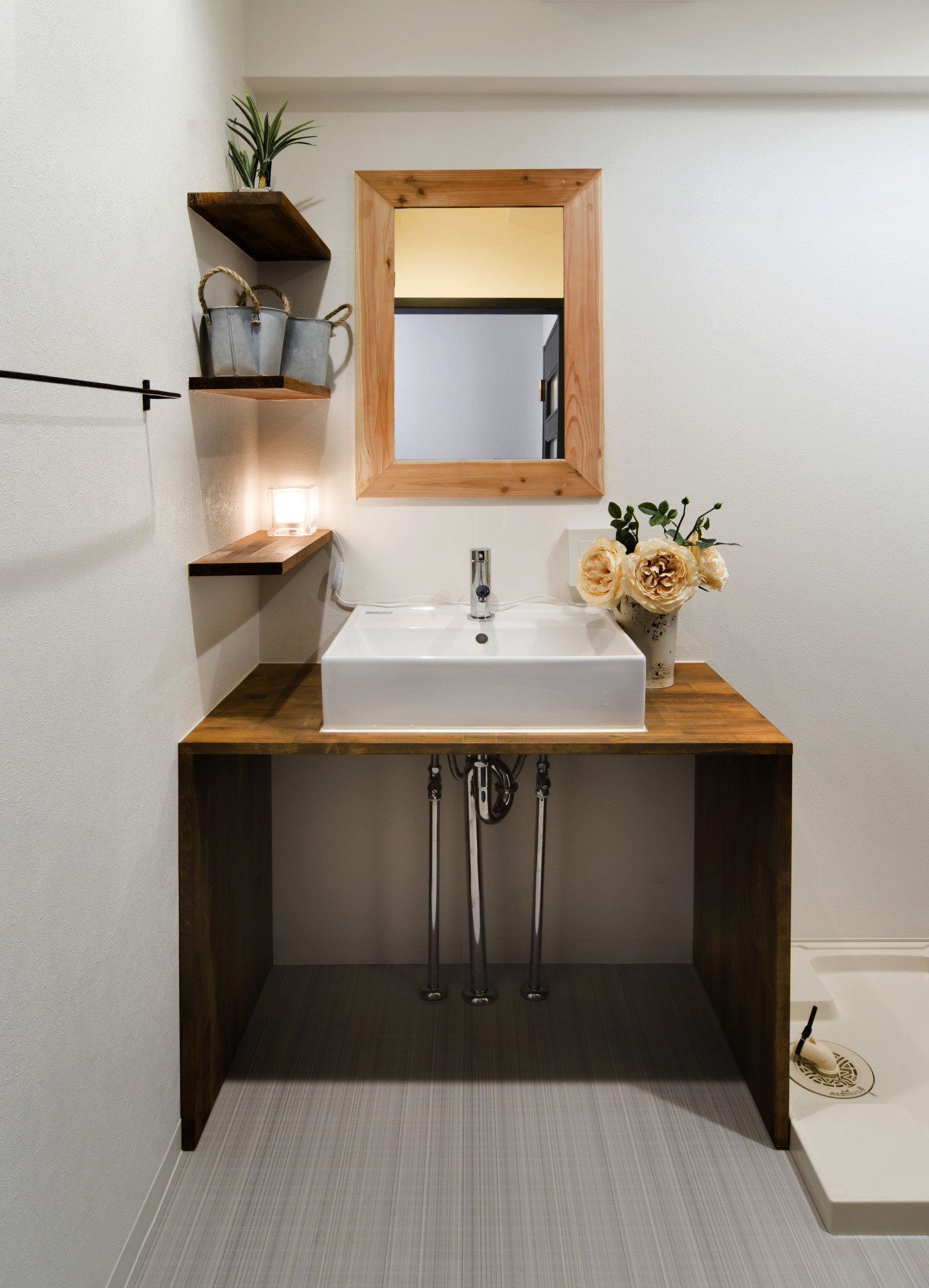 木のカウンターとフレームで温かみをプラスした洗面スペース。無駄を省いたシンプルなデザイン