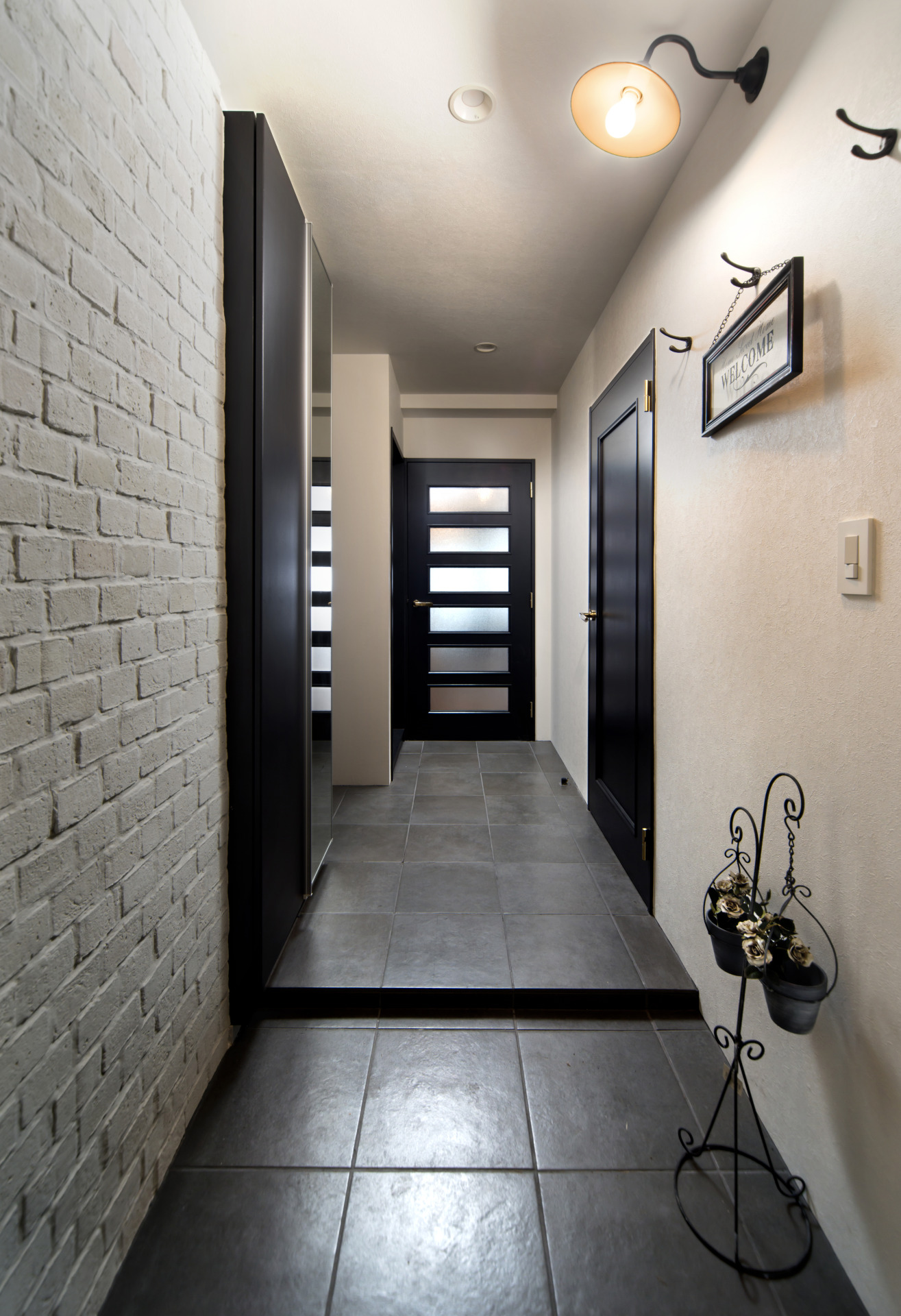 白いレンガ調の壁とブラックのドアが印象的な玄関。落ち着いたモノトーンと間接照明が、帰宅した家族をあたたかく迎え入れる