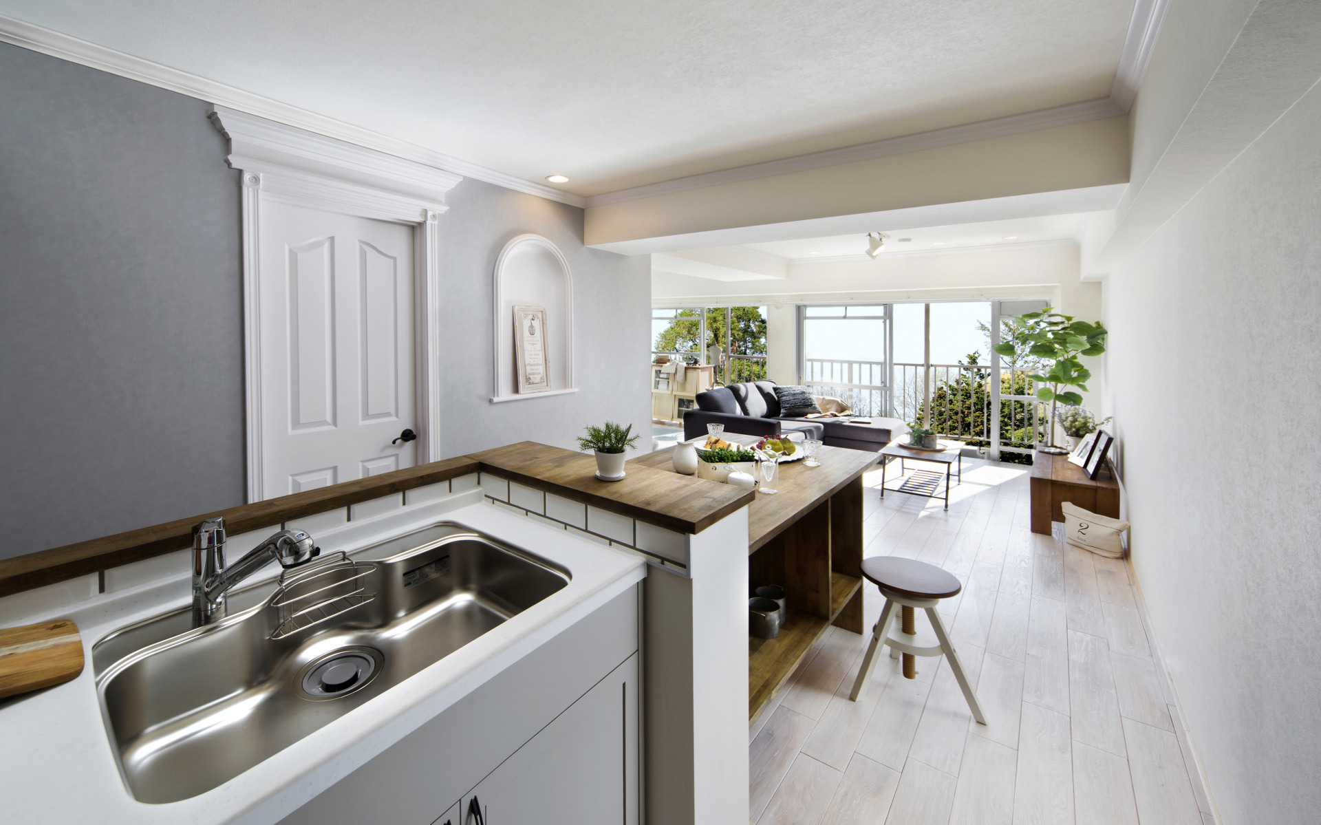 カウンター越しに広がるリビングの眺め。料理をしながら、家族の笑顔や外の景色を楽しめる配置が、日常を特別にしてくれる