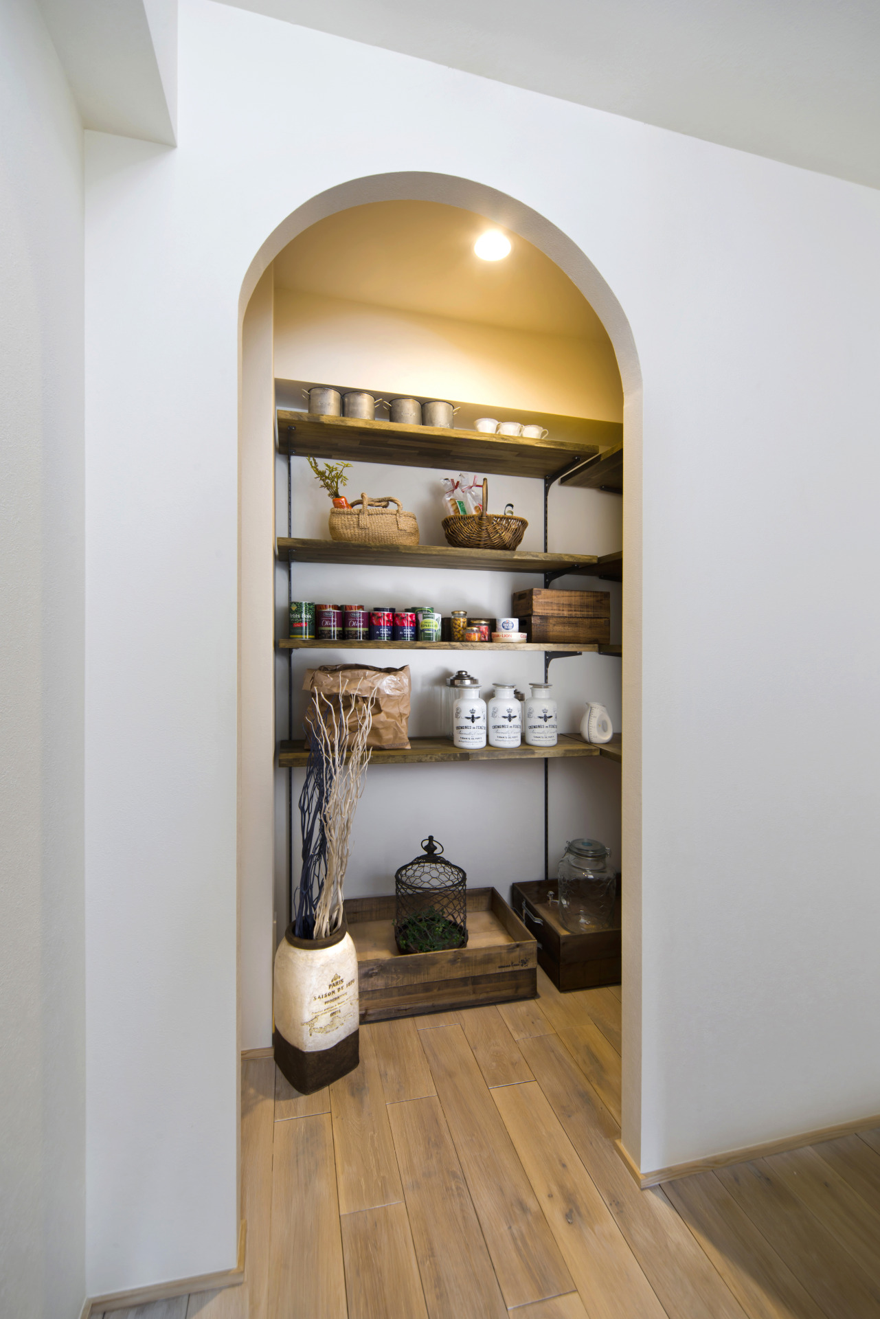 アーチ型の入口が印象的なパントリー。見やすく、取り出しやすい棚が、毎日の家事をスムーズにサポート