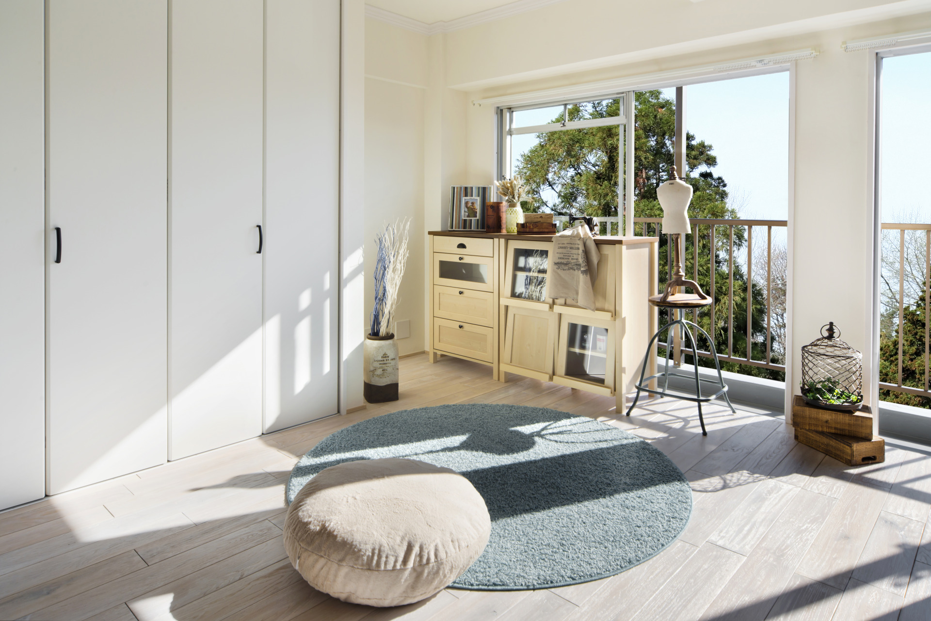 窓辺のやわらかな日差しと緑の景色。趣味を楽しむ場所にも、仕事に集中する空間にもなる、心地よいフリースペース