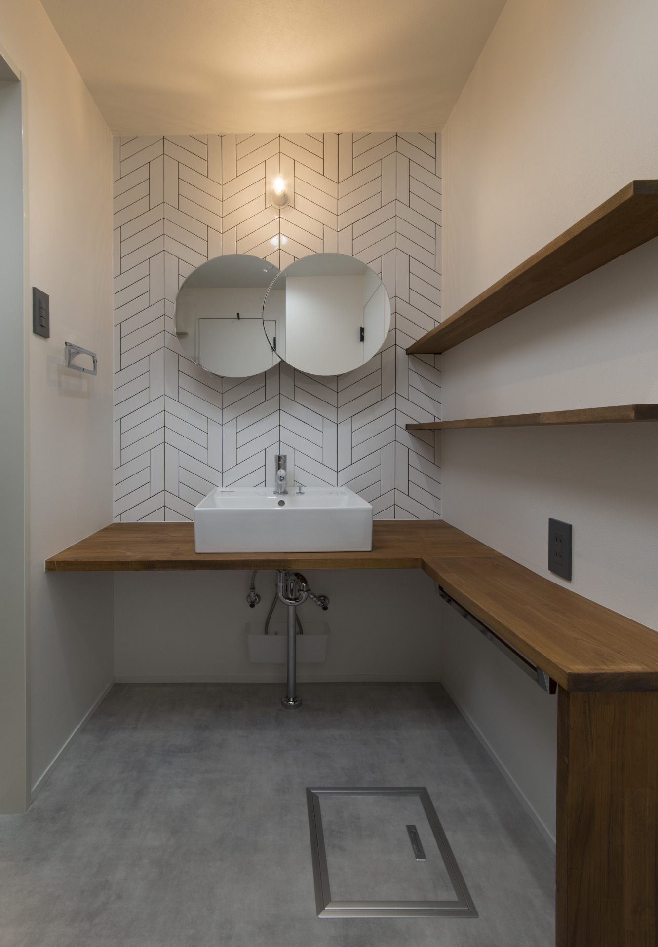 ヘリンボーン柄のタイルと無垢のカウンターが調和する洗面スペース。二枚の丸鏡が個性を添え、スタイリッシュな空間に