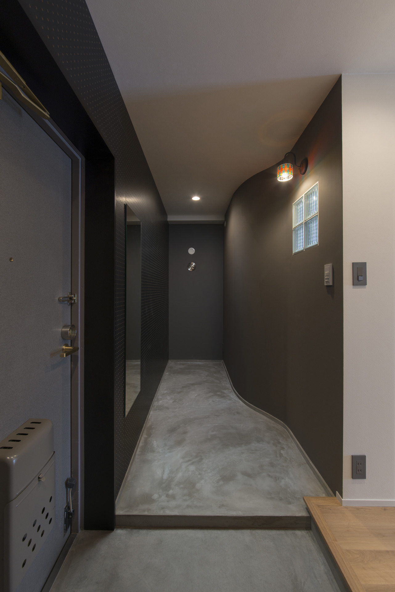 曲線を描くモルタル床と、柔らかな灯りが出迎える玄関。外の喧騒を切り替え、落ち着きのある暮らしを叶えてくれる