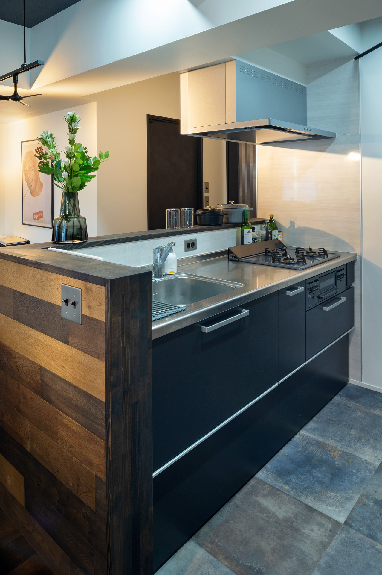 ステンレス×ブラックの組み合わせが印象的なキッチン