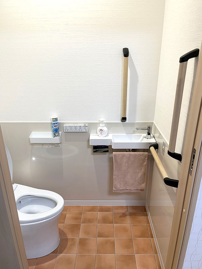 車いすのままでもスムーズに出入りできるよう、開口部の広い引戸を採用しました。 便座は自動開閉・自動洗浄機能付きのタイプを設置し、手洗いも座ったまま使えるオールインワン手洗い器を採用しました。 日常の動作ができるだけストレスなく行えるよう、使いやすさと動線に配慮した空間づくりを心がけました。