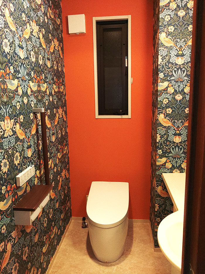当初「シノワズリ柄がいい」とお聞きした際にはイメージが湧かず調べていく中で、ウィリアム・モリスの壁紙をご提案しました。 「これこれ!」とお客様の反応をいただいた時は、ご希望に沿う提案ができた喜びを感じました。 施工面では不安もありましたが、想像以上に美しく仕上がり、トイレ取付に来た職人からも「内装の仕上がりがいいね、リフォームしたって感じがする」と嬉しい言葉をもらいました。