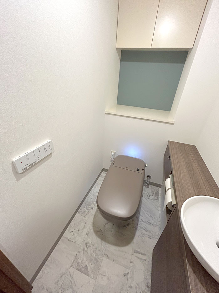 高機能なタンクレストイレが付いた、お洒落な雰囲気のレストルーム