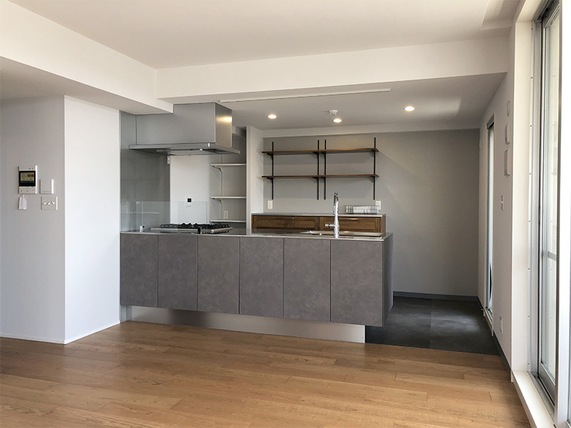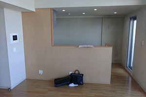下見時は背面に壁があるI型キッチンが設置されていましたが、お客様のご希望により対面式キッチンへ変更して施工しました。 床がスラブ(コンクリート)だったため給排水管の墨出しなどに注意が必要で、事前に注意点をお客様へ丁寧にご説明した上で作業を行いました。 また、カップボード設置面が躯体だったため、コンセントを収めるために壁をふかす処理が必要でした。 キッチンとカップボードの通路幅は冷蔵庫の搬入に直結するため、わずかなズレでも支障が出る可能性があり、施工中は細かい寸法計算と職人との入念な打ち合わせに時間をかけて対応しました。