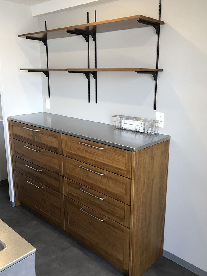カップボード横に間仕切り壁を設けて可動棚を取り付け、パントリー風にすることで収納力アップをご提案しました。