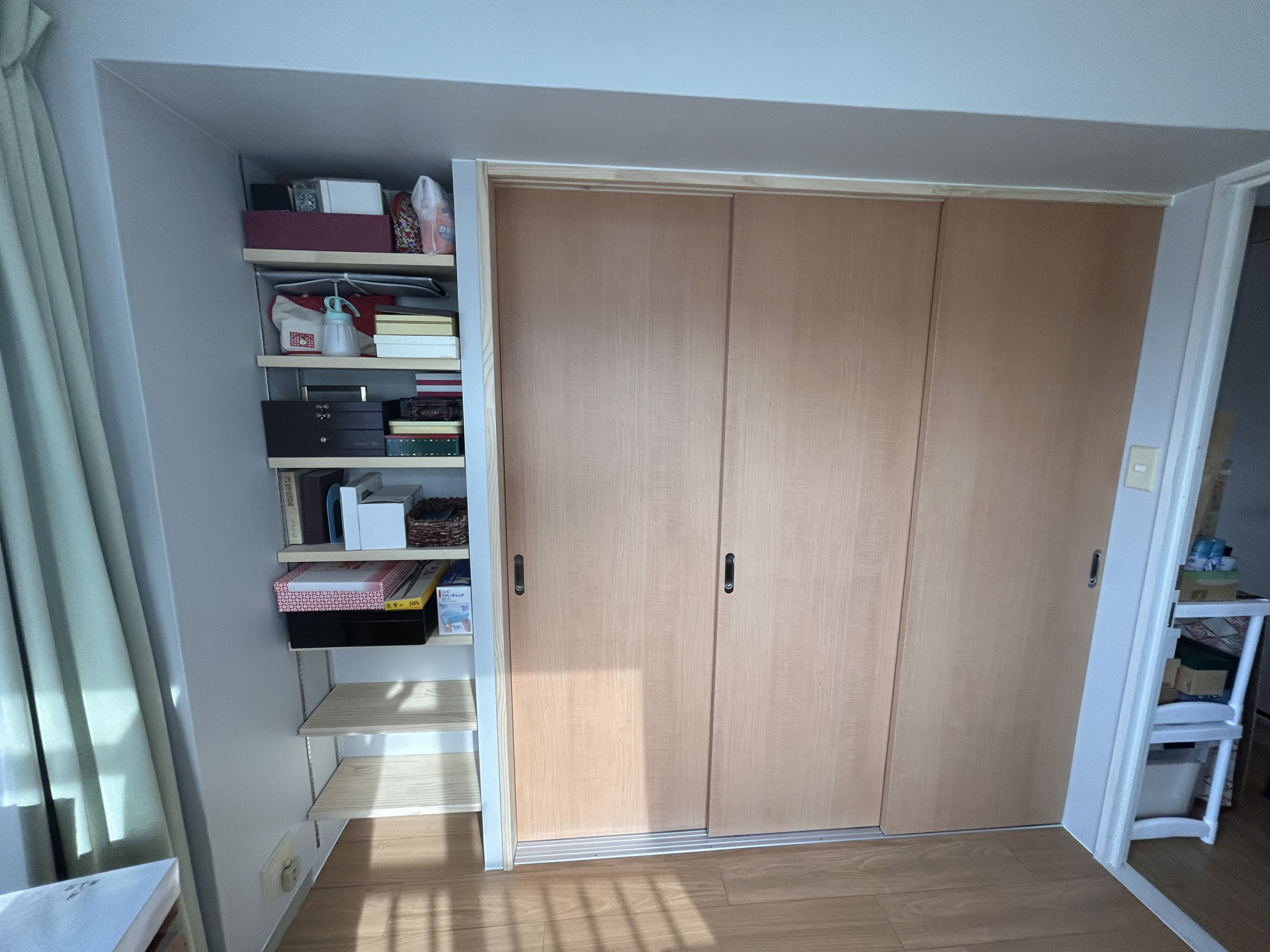 マンションで収納力をアップするには、場所によっては難しく、今回は生活に合わせた収納を検討しご提案しました。 既存の棚とクローゼットを全てクローゼットへ変更し、新たにパイプシャフトの壁を改修し棚を設けました。 クローゼットは造作し、扉はリクシルのラシッサをお取り付けしました。