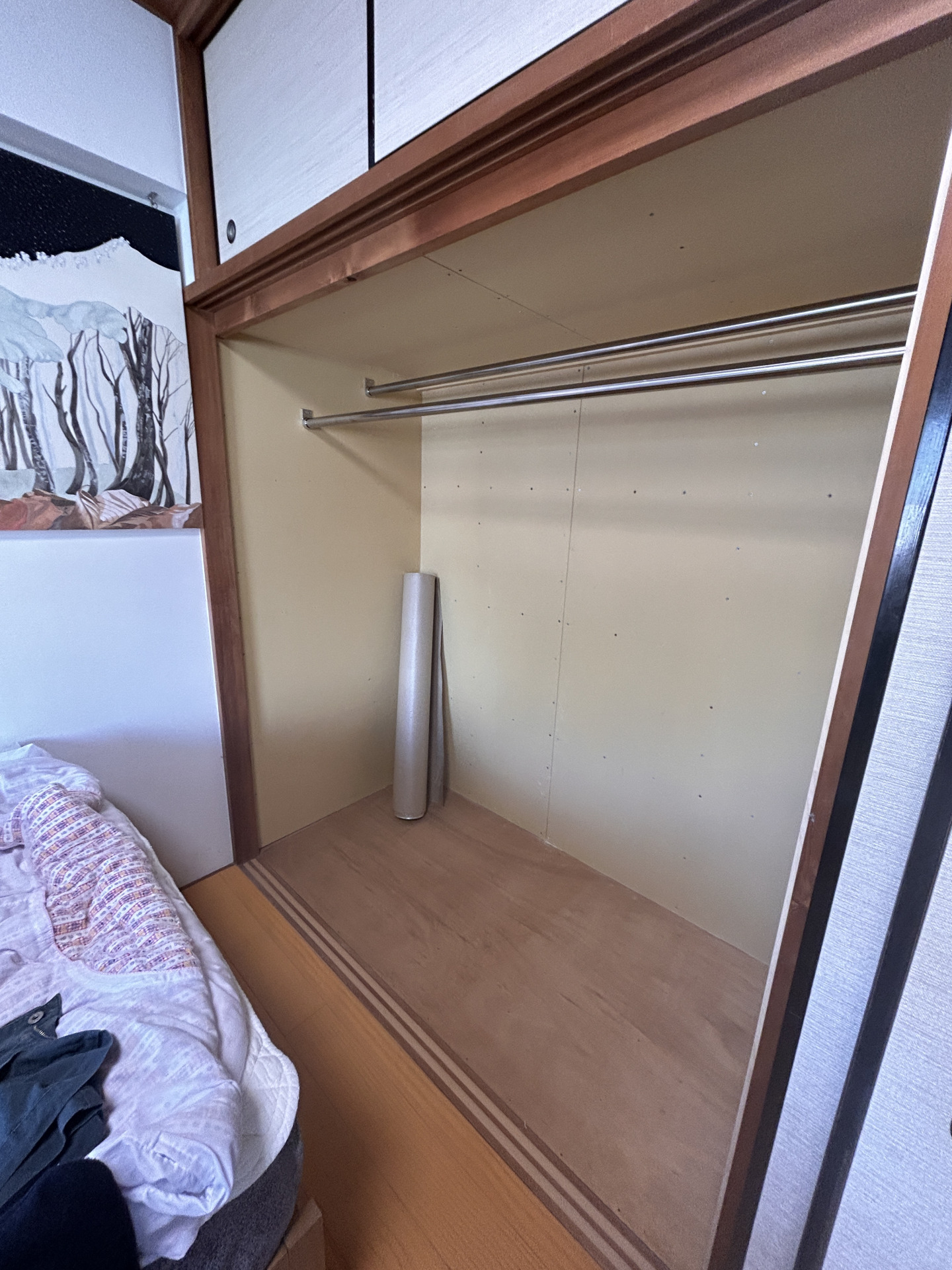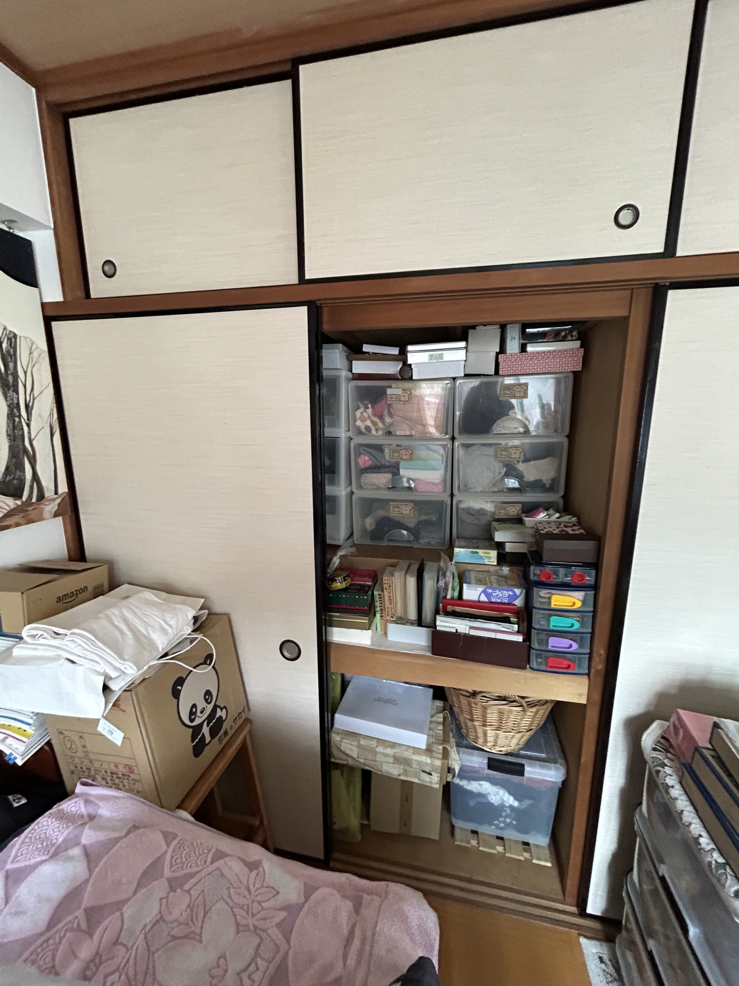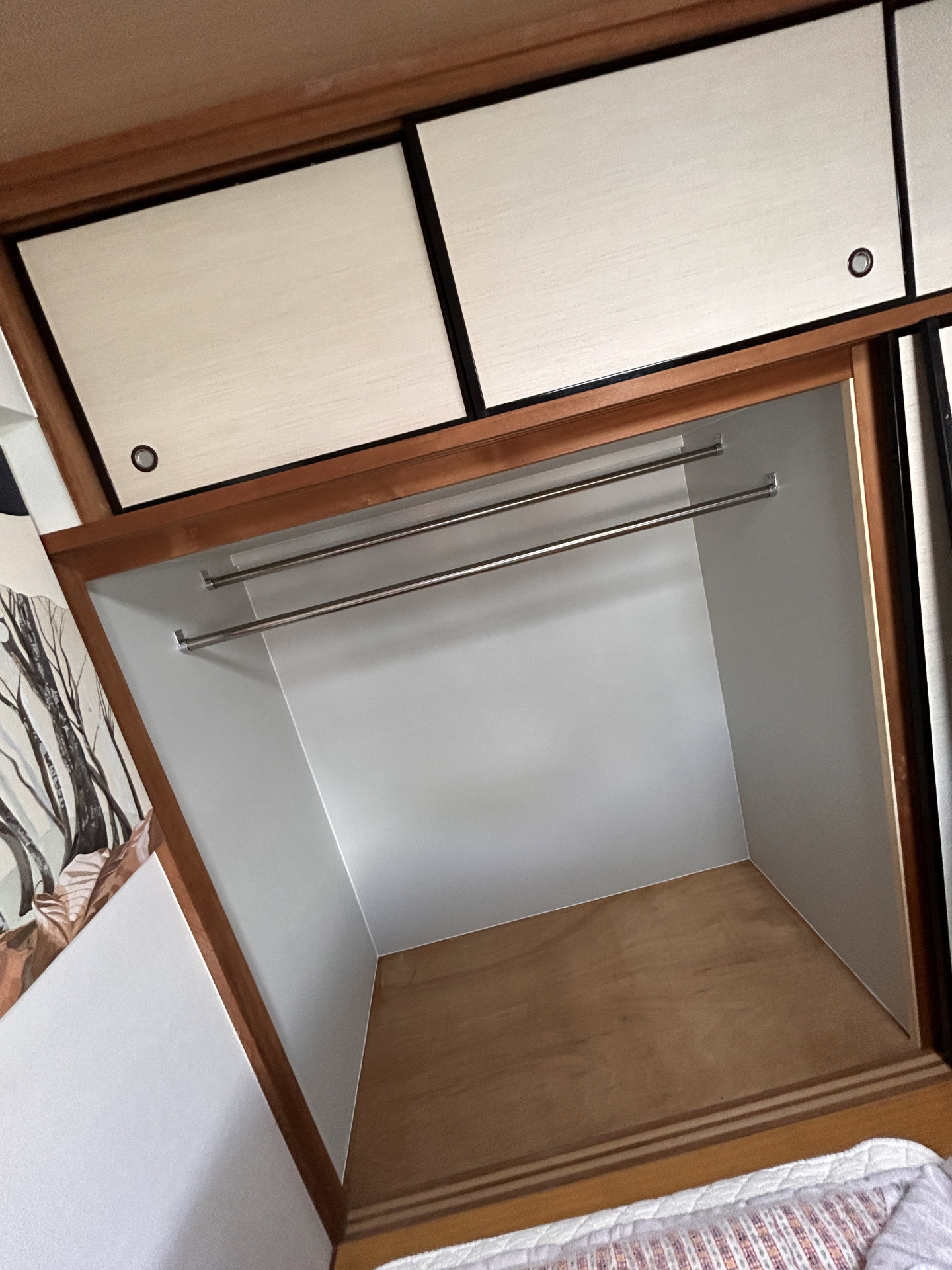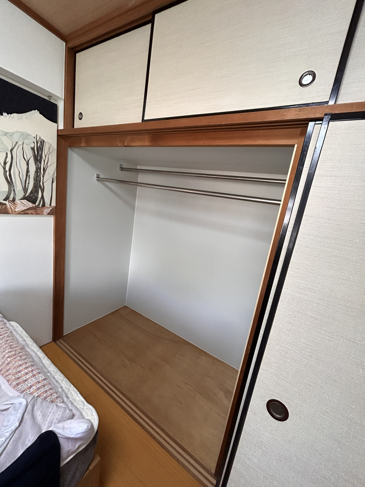 和室の雰囲気を壊さずに、襖間そのまま再利用し、生活に合わせた収納スペースのご提案させていただきました。 既存の中段は撤去し、下には高さを気にせず収納ボックスが置けるようにしました。 また、上にはハンガーラックを設け、洋服が収納できるよう生活に合わせ改修しました。