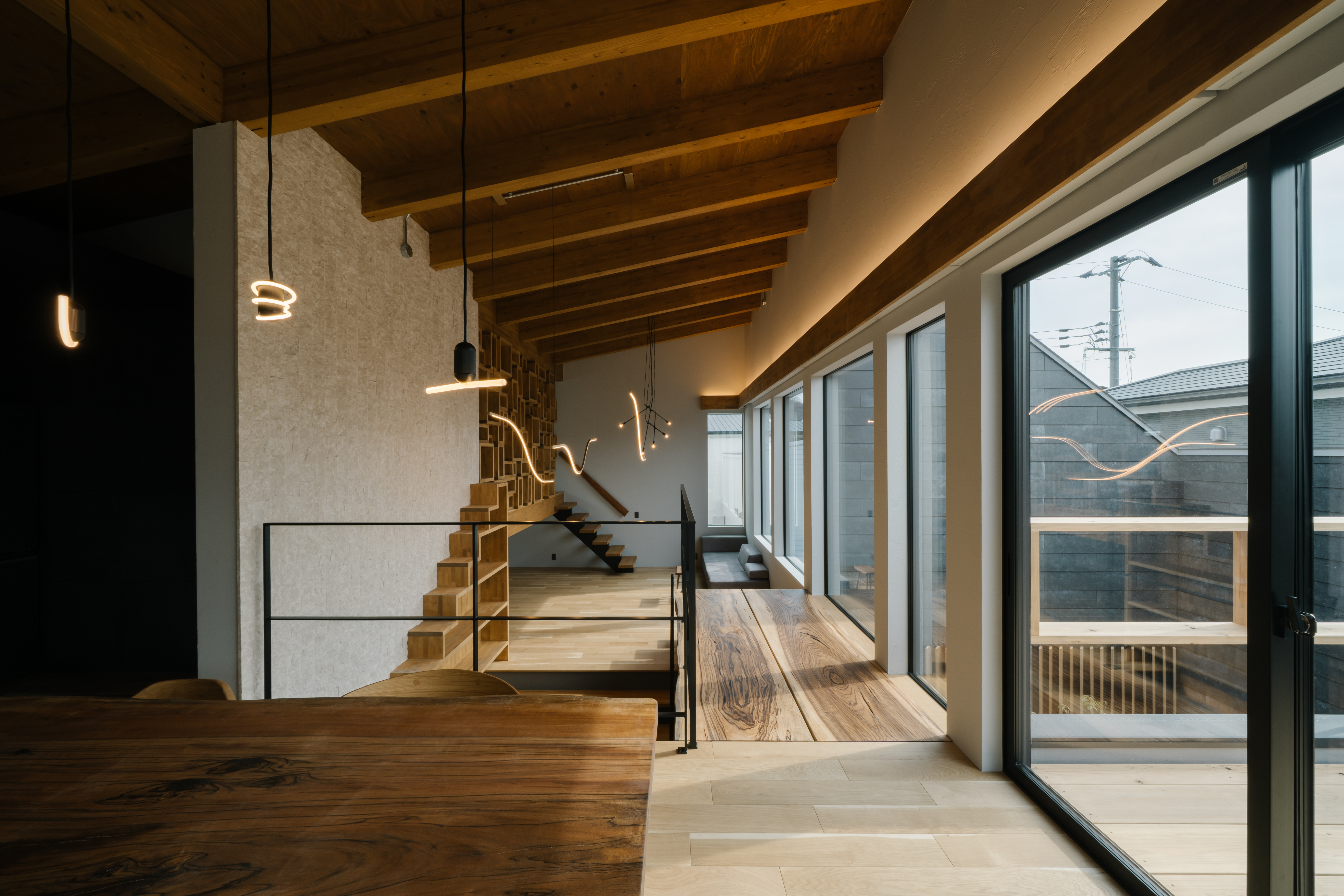 SE構法による大空間、耐震性能へのこだわり、自然素材が醸す柔らかな空気感、随所に散りばめられた造作家具や職人の手仕事。どこに立っても“絵になる”空間の連続が、この家の大きな特徴です。
