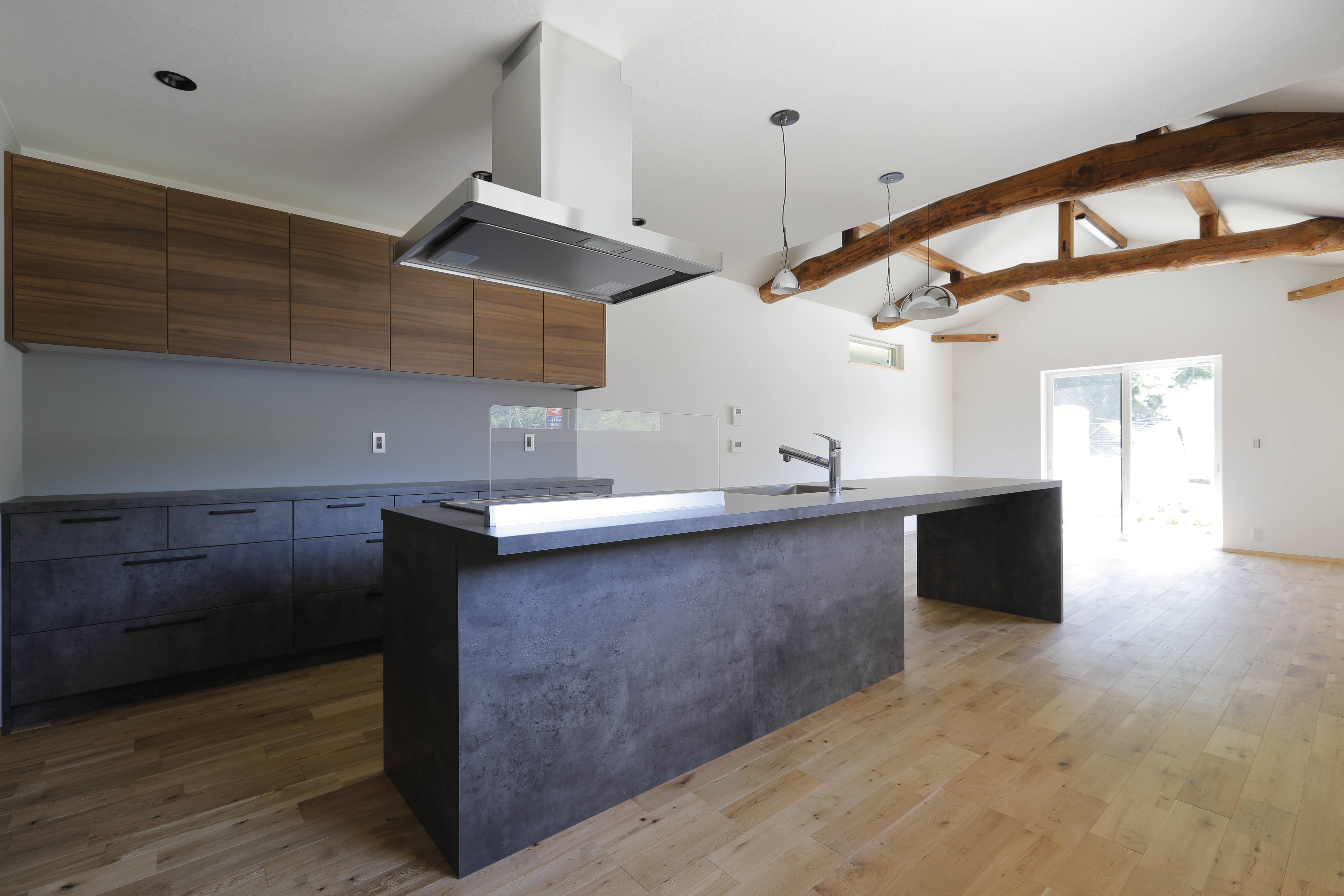 室内に足を踏み入れると、古材の梁が美しく残された大空間が広がります。かつての家の面影を感じさせながらも、キッチンや壁、照明計画は現代的に刷新し、暮らしやすさとデザイン性を両立。重厚感のあるキッチンと、年月を刻んだ梁とのコントラストは、この家にしか出せない唯一の景色です。