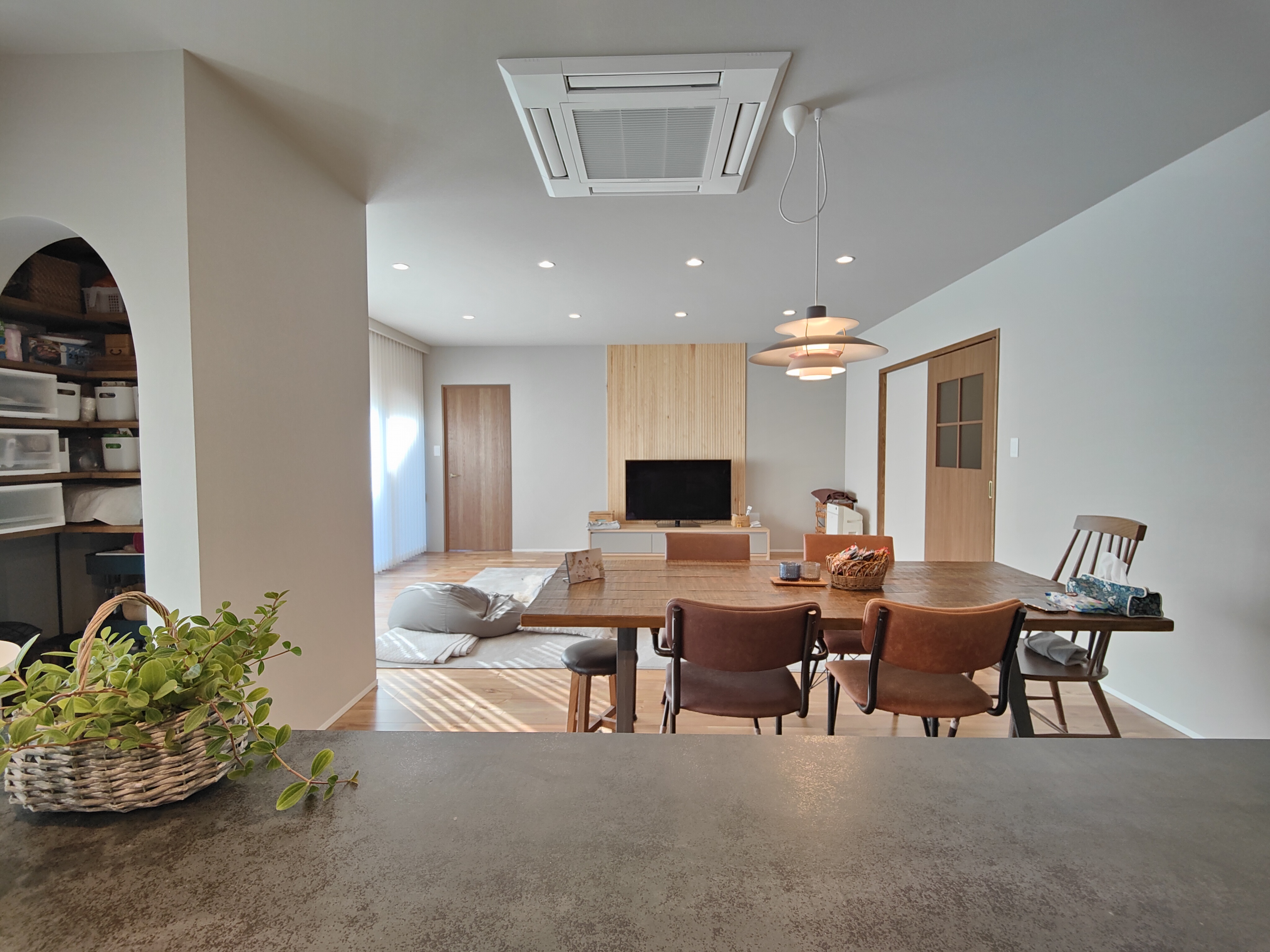 昼のリビングは、明るさと開放感が印象的。白壁と自然素材の木の組み合わせがつくる柔らかな空気感に、テレビボードや扉の木の調和が美しく溶け込みます。小さなお子さまがごろごろできるスペースも確保され、家族がそれぞれ思い思いに過ごしながら、同じ空間でつながれる場所になりました。