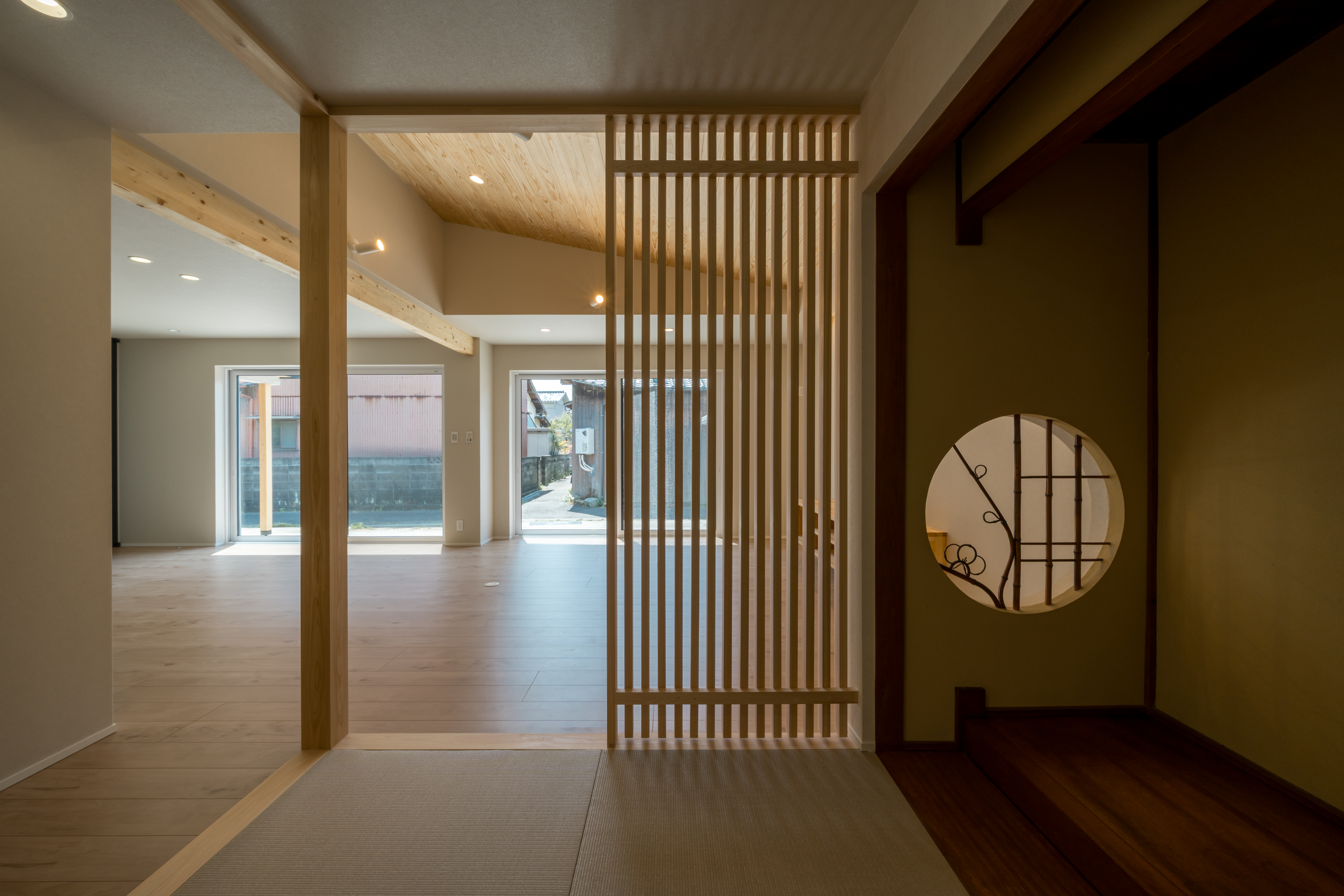 内部に足を踏み入れると、そこには上品な和モダン空間が広がります。柔らかな光を通す縦格子、丸窓がつくる印象的な陰影、そして天井の木目が生み出すやわらかなぬくもり。和の要素を大切にしながらも、モダンで洗練された雰囲気に仕上げ、懐かしさと新しさが心地よく共存しています。