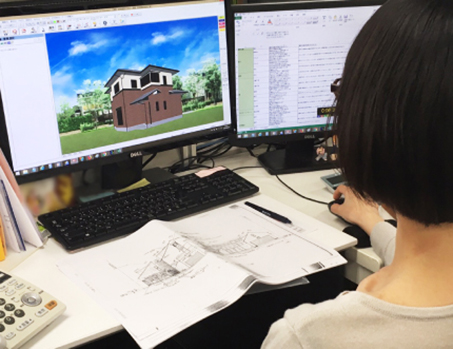 プランニングにおいては、お客様に分かりやすくお伝えするために、3D CADソフトを使用して図面やパースを作成しています。 外壁塗装の場合はカラーシミュレーションも行いますが、ノートPCを持参して直接お見せするか、会社にご来社いただいて一緒に確認することが多いです。