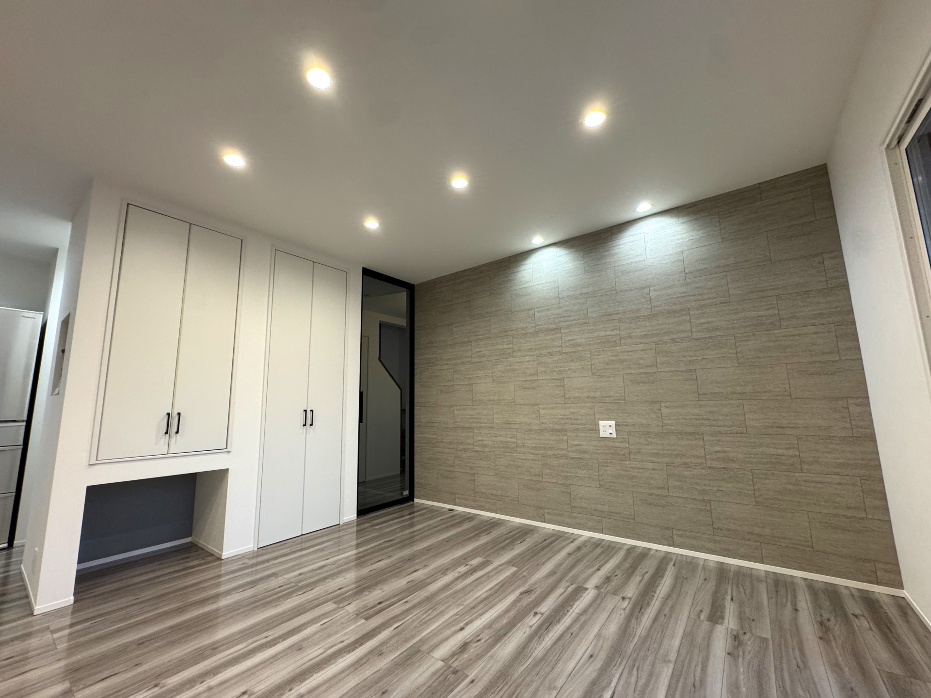 ・思いきって窓をなくし、壁一面にタイル調アクセントクロスを採用。お部屋の印象がぐっと引き締まり、落ち着いた雰囲気に仕上がりました。