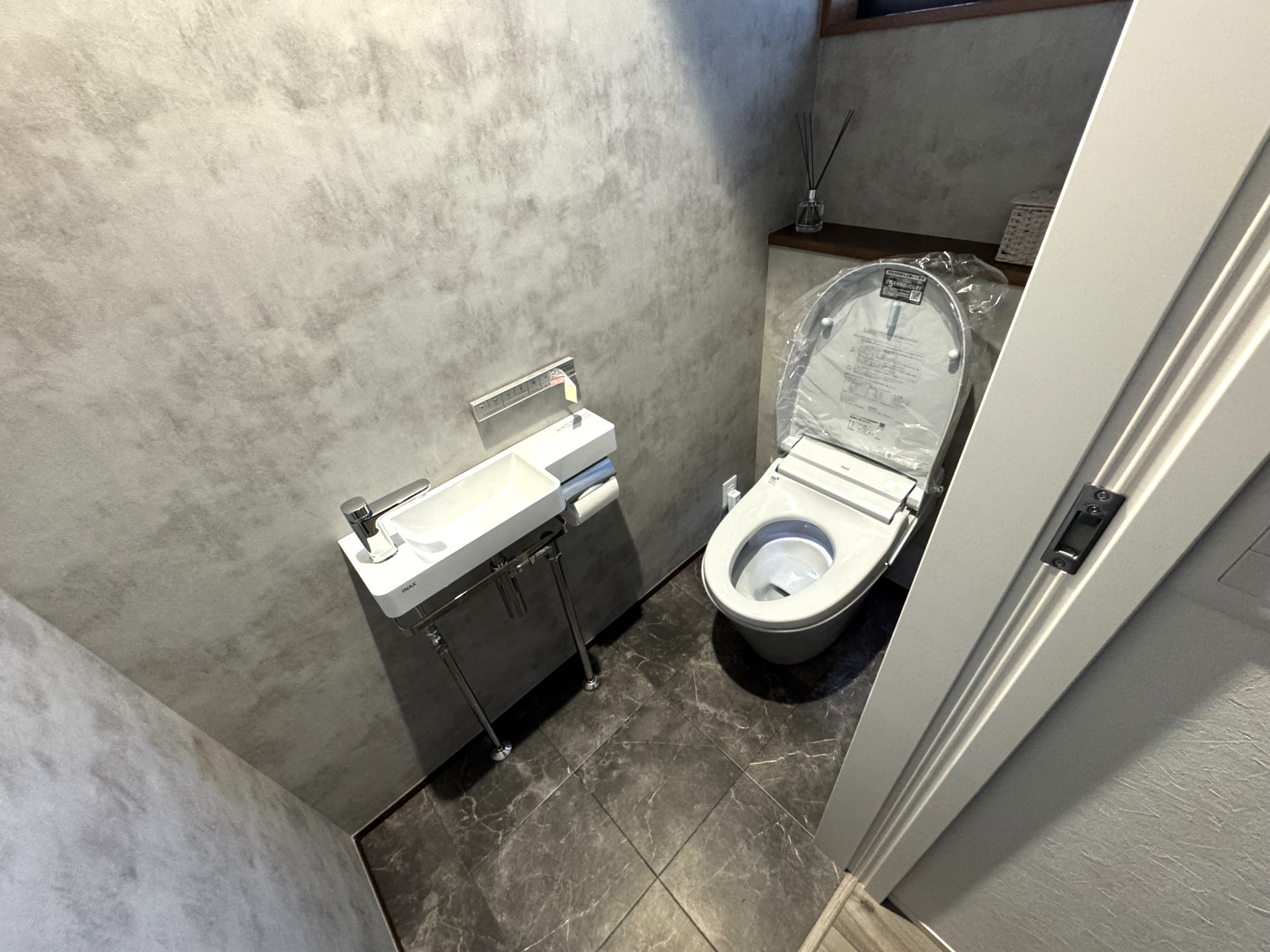 ・トイレは配置を見直して、ゆとりのある1帖空間に。手洗い器を別に設け、まるでお店のようなスタイリッシュな雰囲気に仕上がりました。