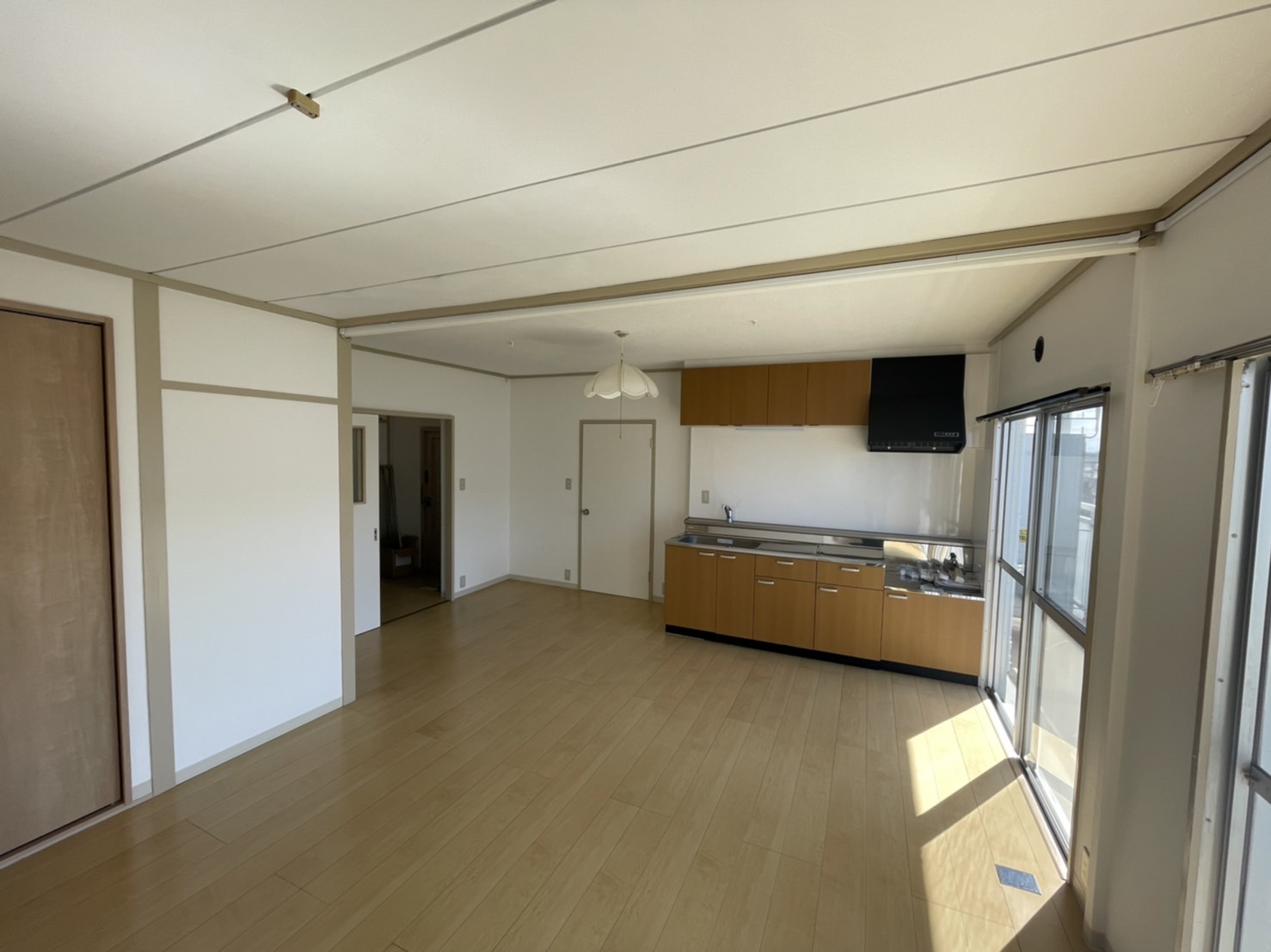 左の写真はDKと和室の間仕切り壁を撤去しLDKに変更し、フローリングを施工した写真です