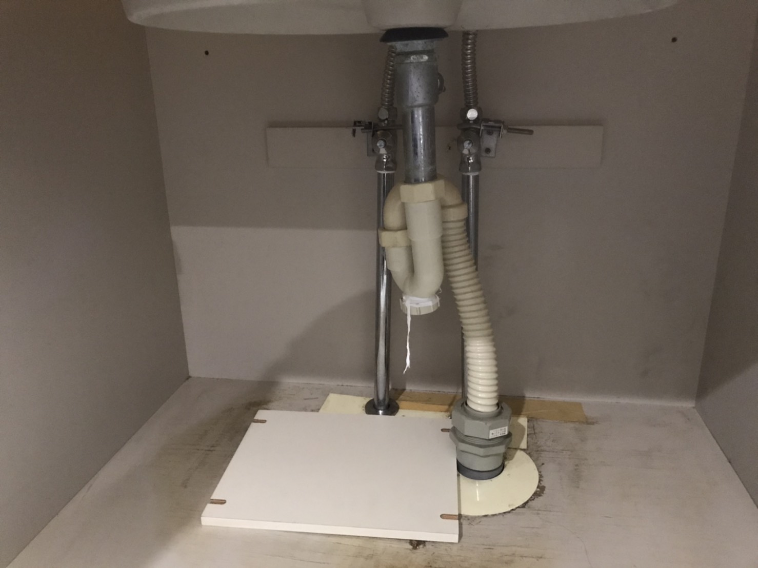 写真は洗面化粧台の排水管と底板の修理をした前後写真になります