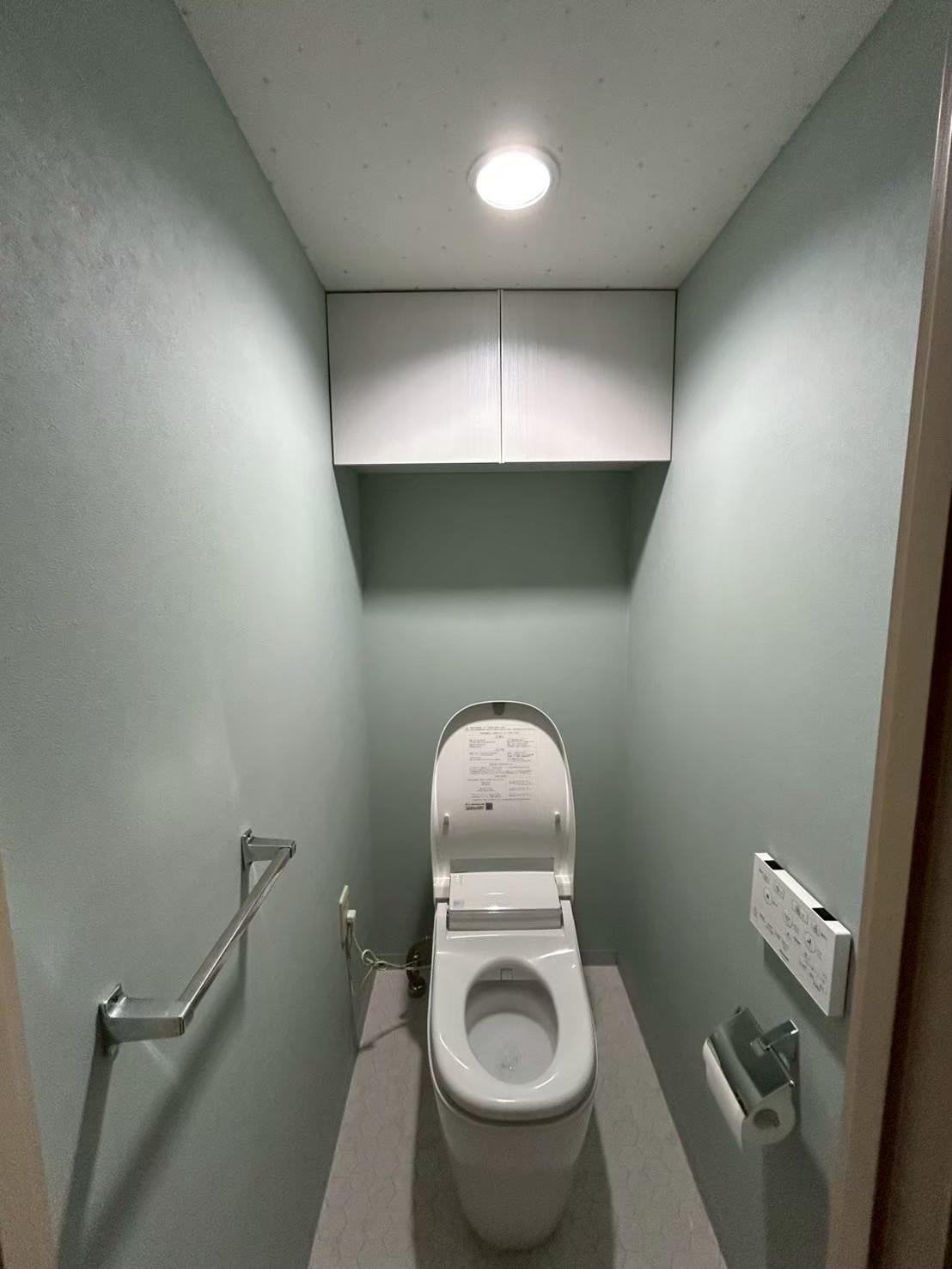 床をクッションフロア、壁をクロスに張り替えて、トイレ内をスタイリッシュな印象に改装して、トイレ本体については、継手が少なく掃除がし易い一体型トイレへの交換をご提案しました。
