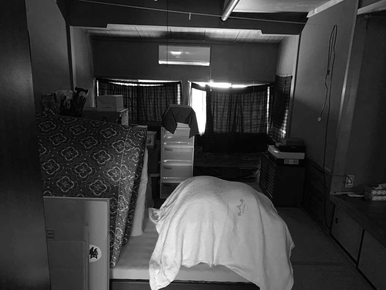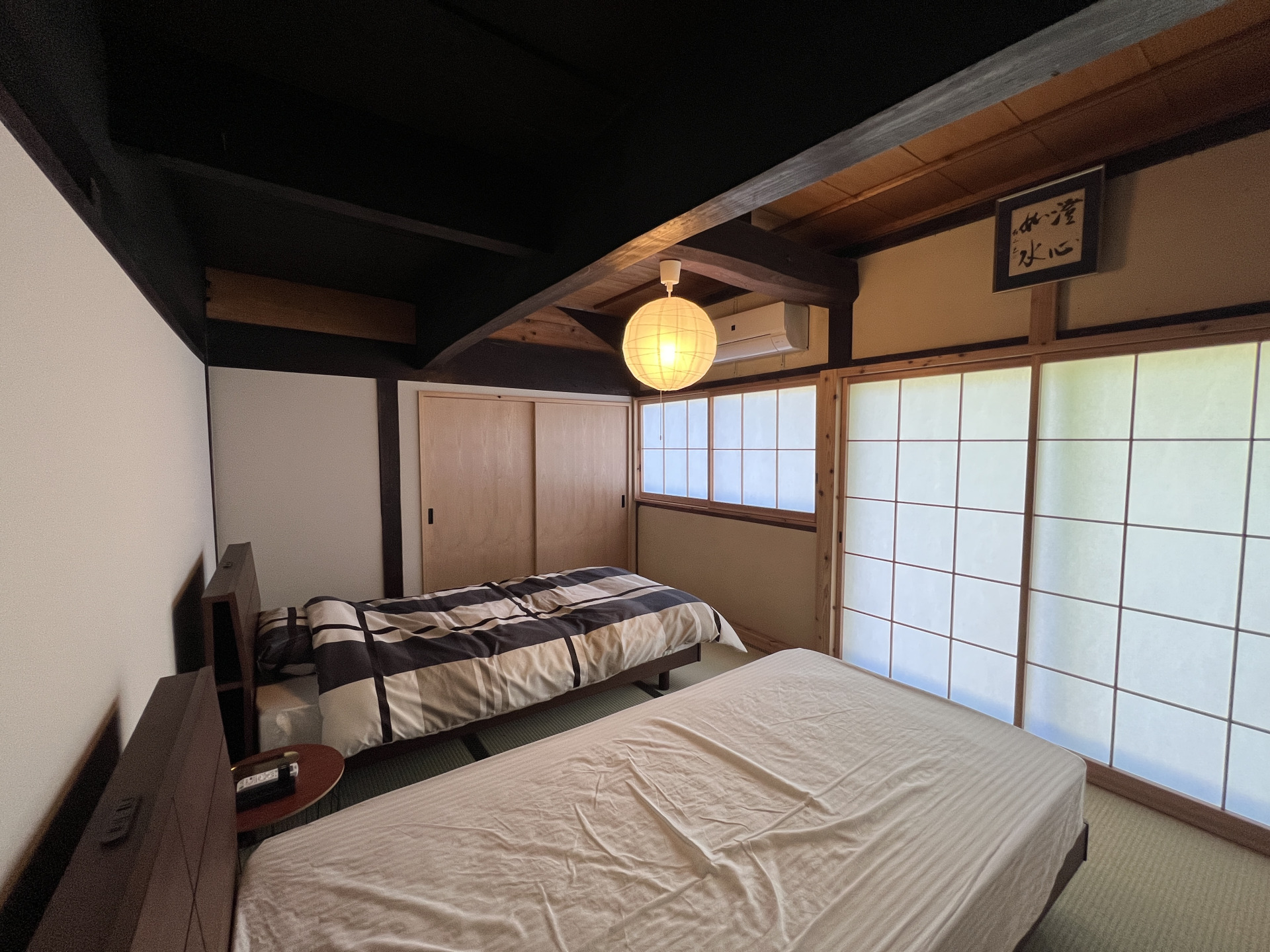 1番静かな部屋は、畳にベッドを置いた寝室に。大人数での利用の場合は、和室二間を使って敷布団で寝ることもできます。