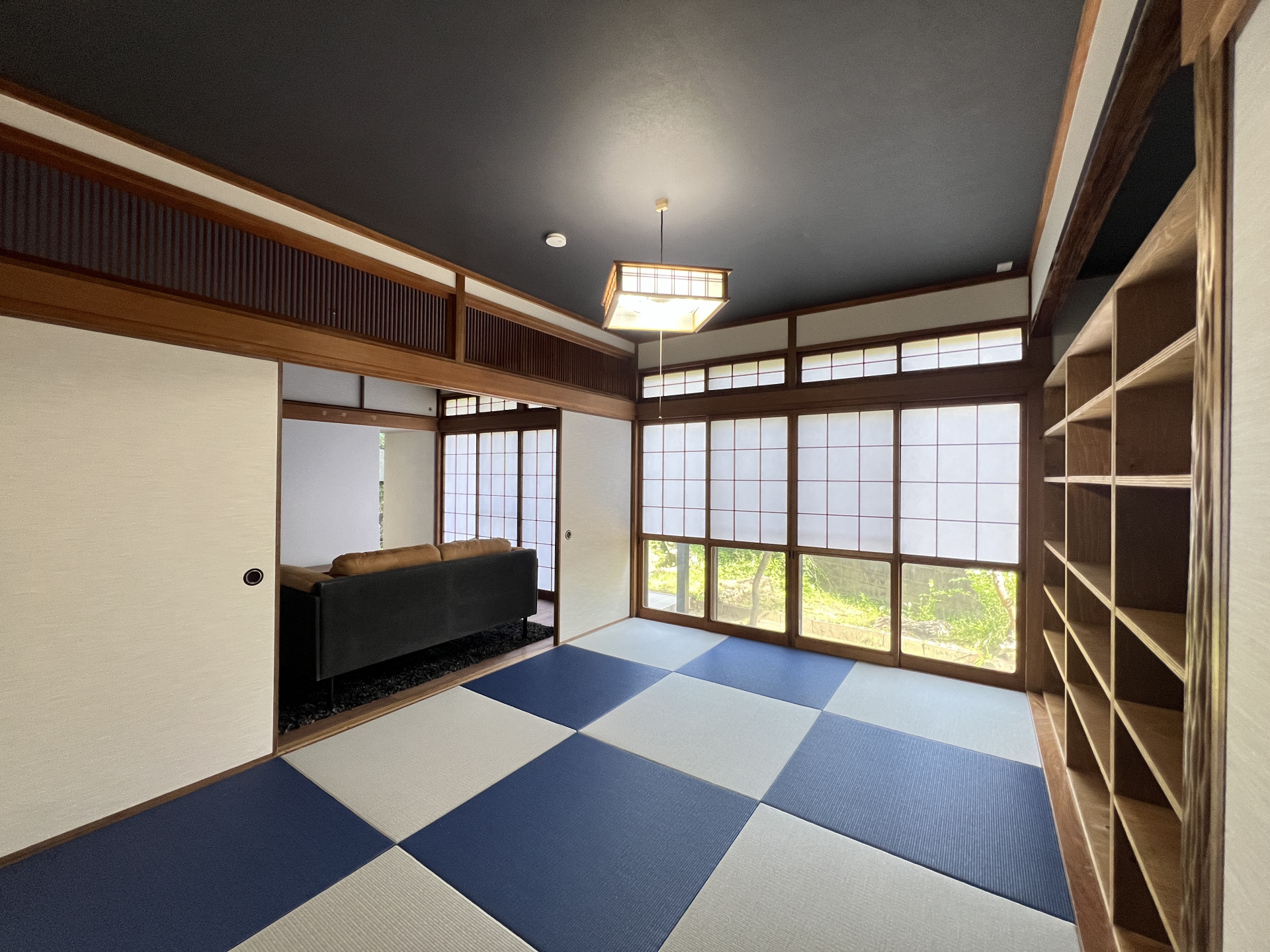 銀鼠色と藍色の半畳タタミに欄間を残した和室。壁一面には、造作の収納棚を。