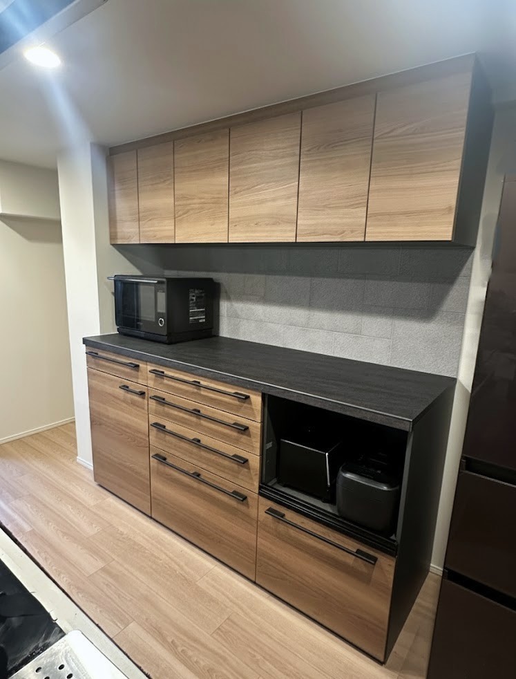 クローゼットがあった所にTVボードを造作し、ソファで寛ぎながらTV鑑賞できるようになりました。