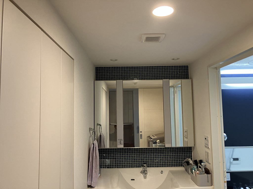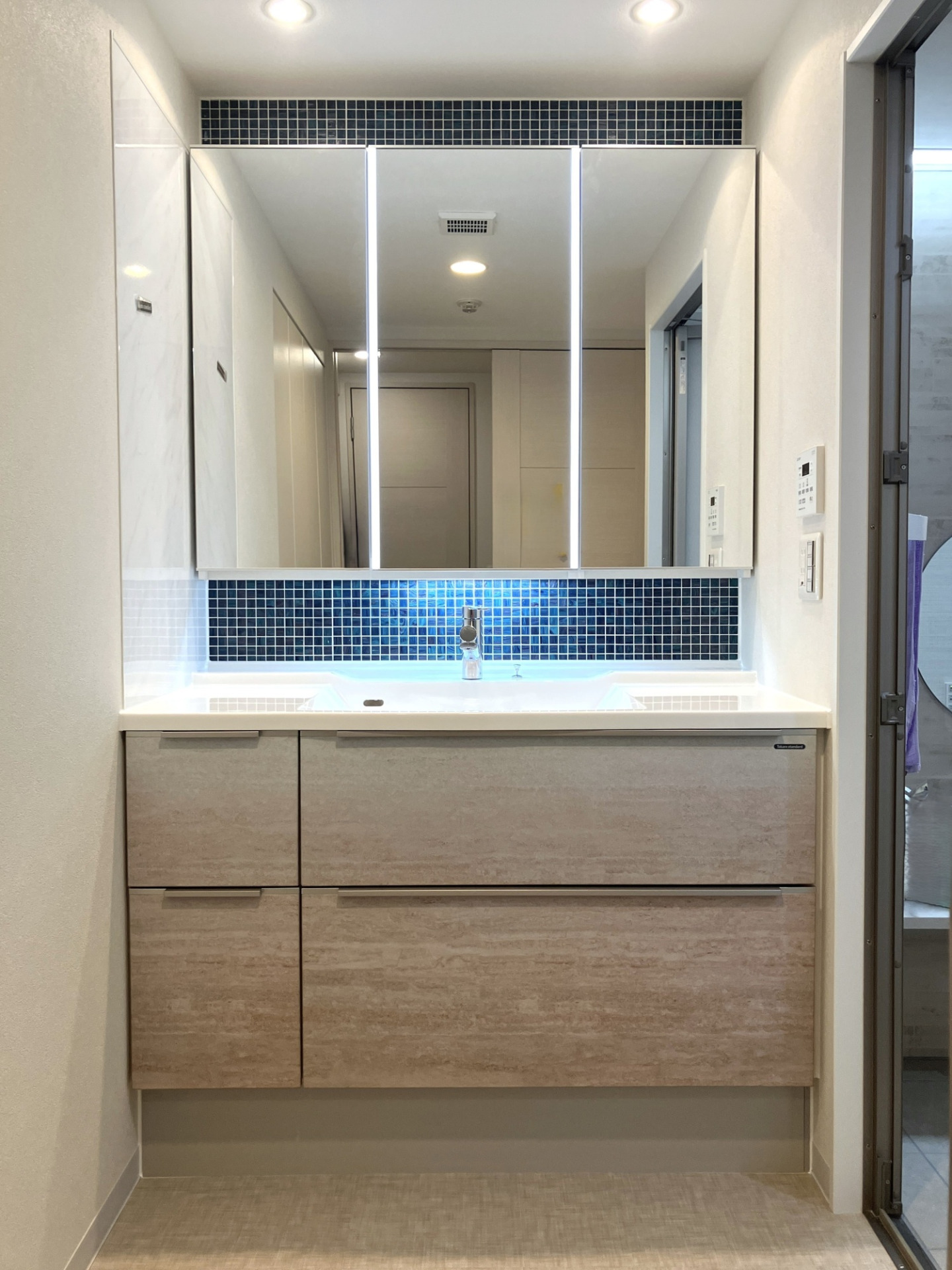 洗面室は、既存のネイビーのモザイクタイルを活かしつつ、扉のホワイトからベージュへのグラデーションが優しいラグジュアリー空間に仕上げてくれました。